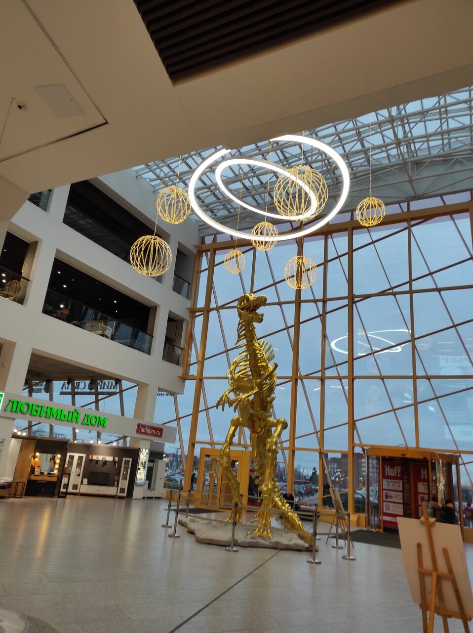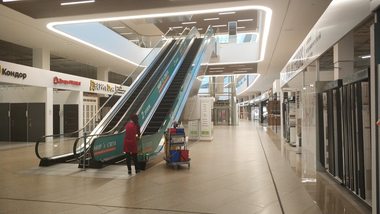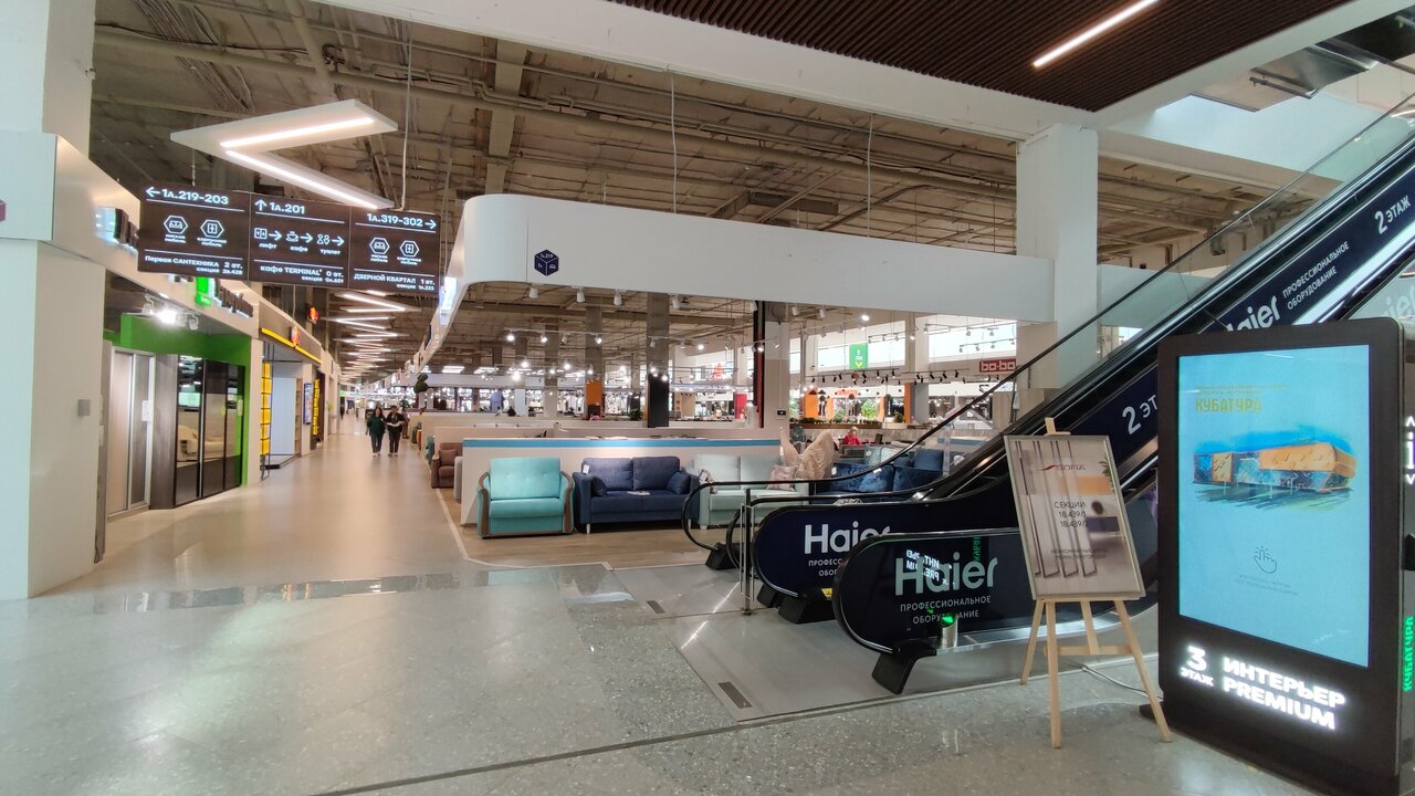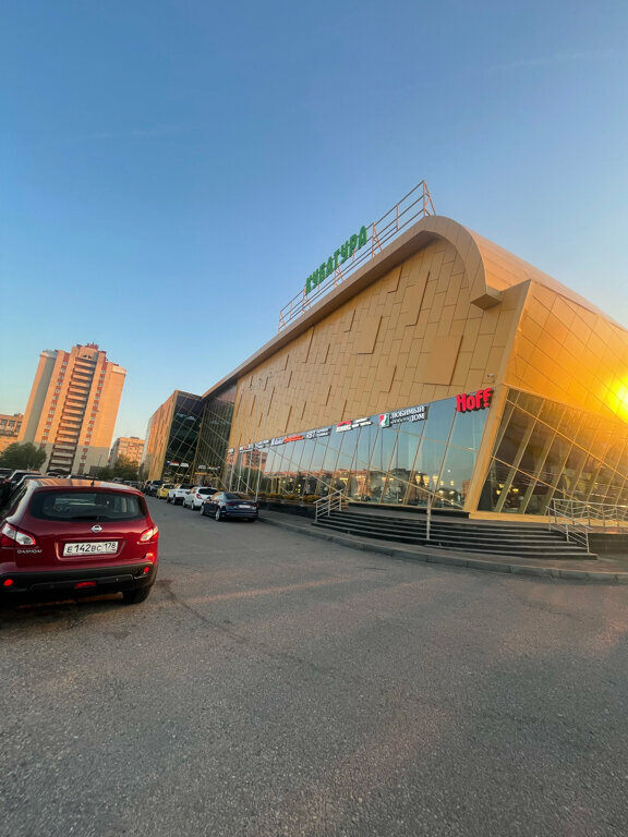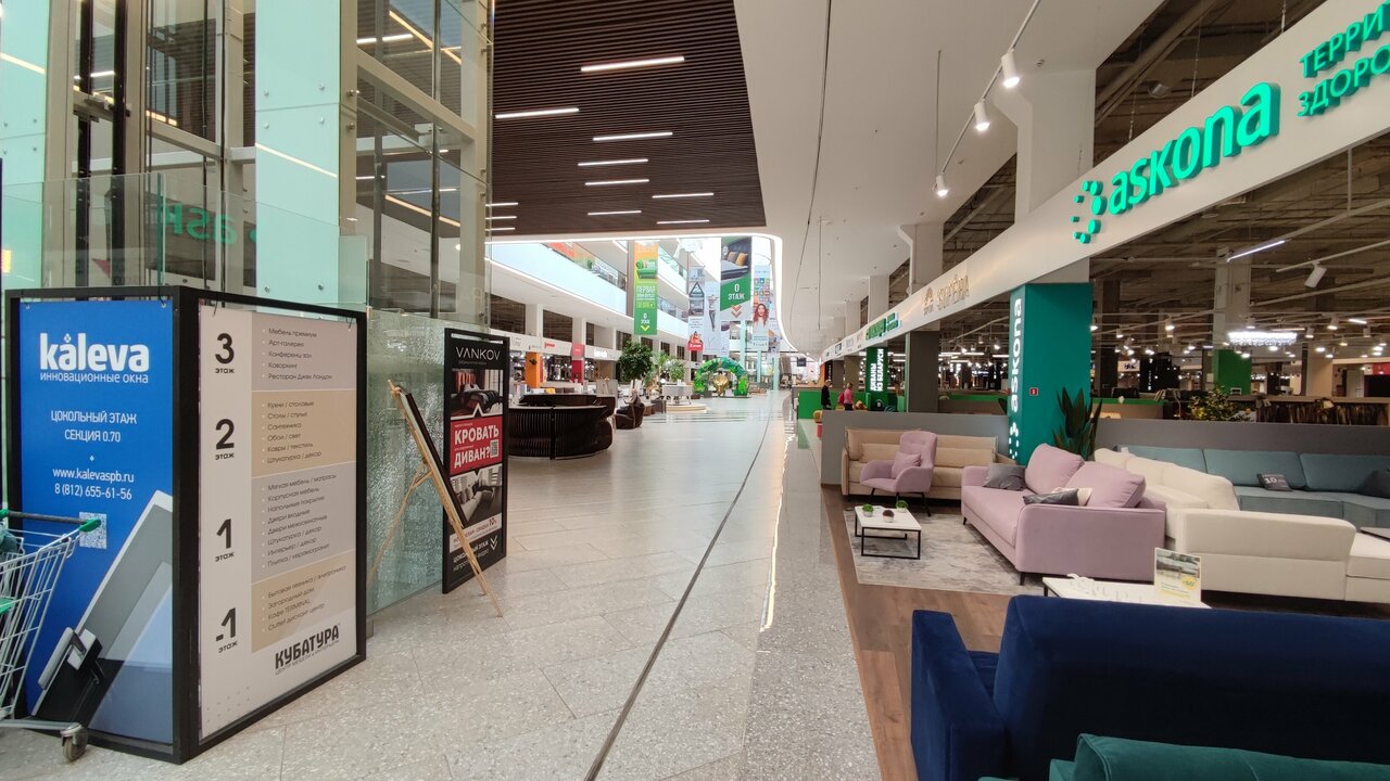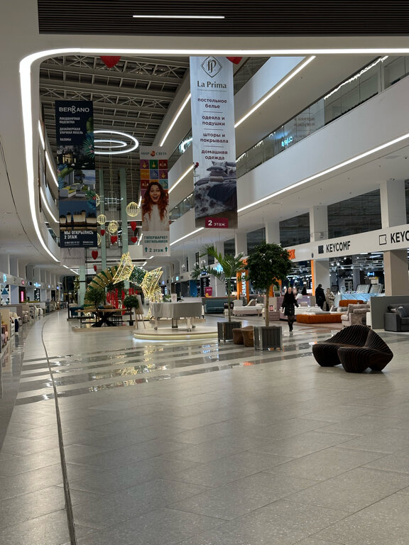 Очень большой центр, расположен недалеко от метро и в шаговой доступности от остановок общественного транспорта, при этом очень большая парковка для личных автомобилей. Хочется отметить удобное расположение внутри центра, так мебель различных производителей и поставщиков представлена в центре на первом этаже, на этом же этаже, к конце зала, огромный выбор дверей, как входных так и межкомнатных, при этом они опять же расположены они в одном месте. Большой выбор ковров. На втором этаже удобно расположен магазин Hoff, где обилие предметов для интерьера, чем-то напоминающее IKEA. Нигде не встретила не довольных клиентов, очень приветливый персонал торговых точек. Единственный минус этого центра — отсутствие точек общественного питания, а так хочется после продолжительного шопинга насладиться чем-то вкусненьким)))