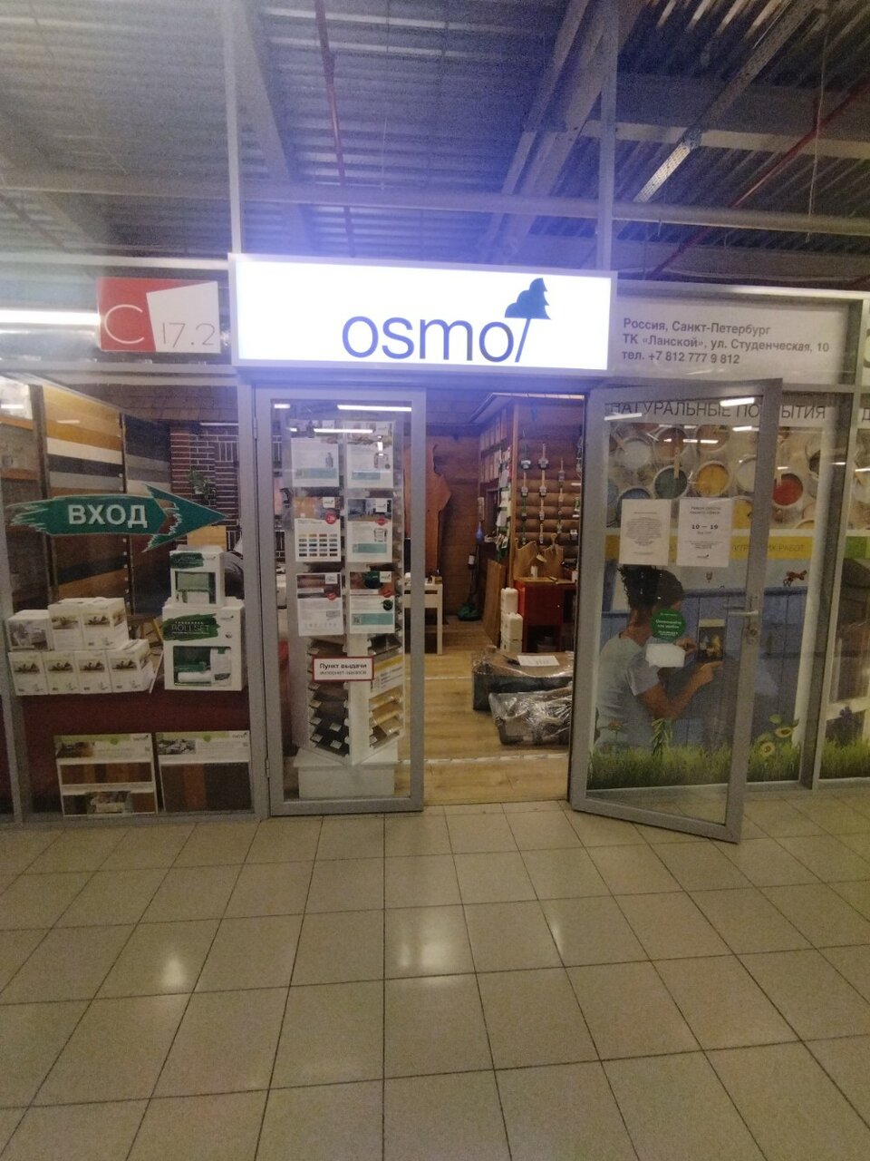 Osmo — строительный магазин в Санкт-Петербурге, предлагающий материалы, инструменты и товары для строительства, ремонта и отделки. Расположен по адресу: Студенческая ул., 10, секция С17.2, 3 этаж. Работает с понедельника по пятницу с 10:00 до 19:00. Контакты: +7 (812) 415-44-68, +7 (812) 777-98-12, +7 (911) 762-87-69, +7 (921) 432-08-00, +7 (981) 189-71-74. Подробнее на сайте: (https://osmokraska.ru/).