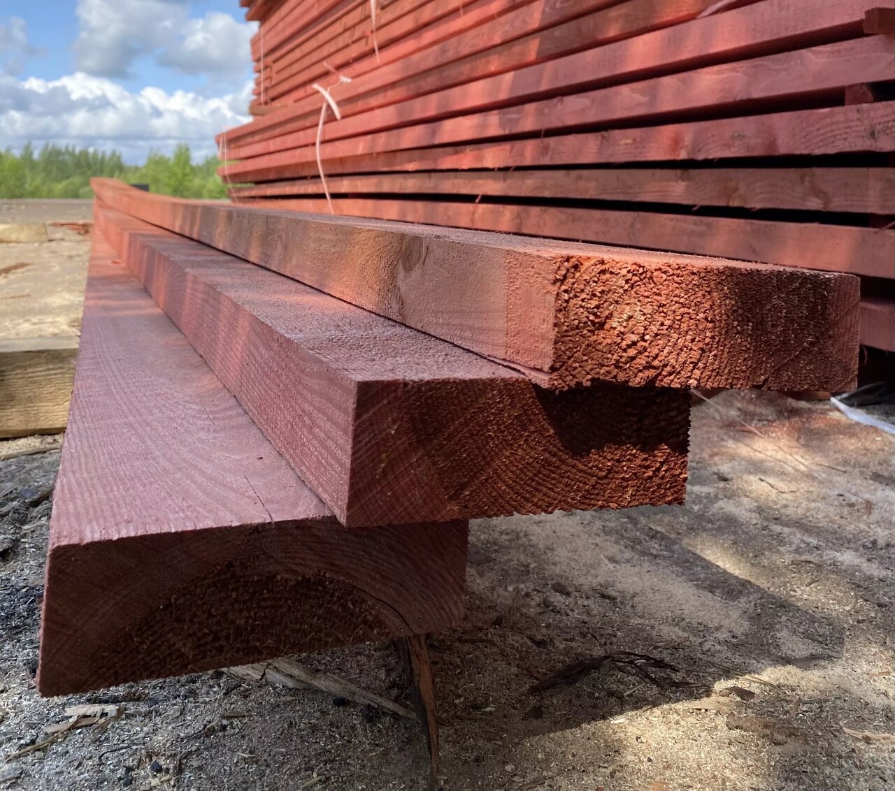 Доска, брус кривые, антисептик смылся после первого дождя, плесень чёрная и белая началась через пару недель, менеджер ошиблась в расчетах на 5,5 м3 (почти 100000 руб, посмотрела не в тот столбец в проекте), доску назад не приняли и ошибку не признали, позорище, не рекомендую никому