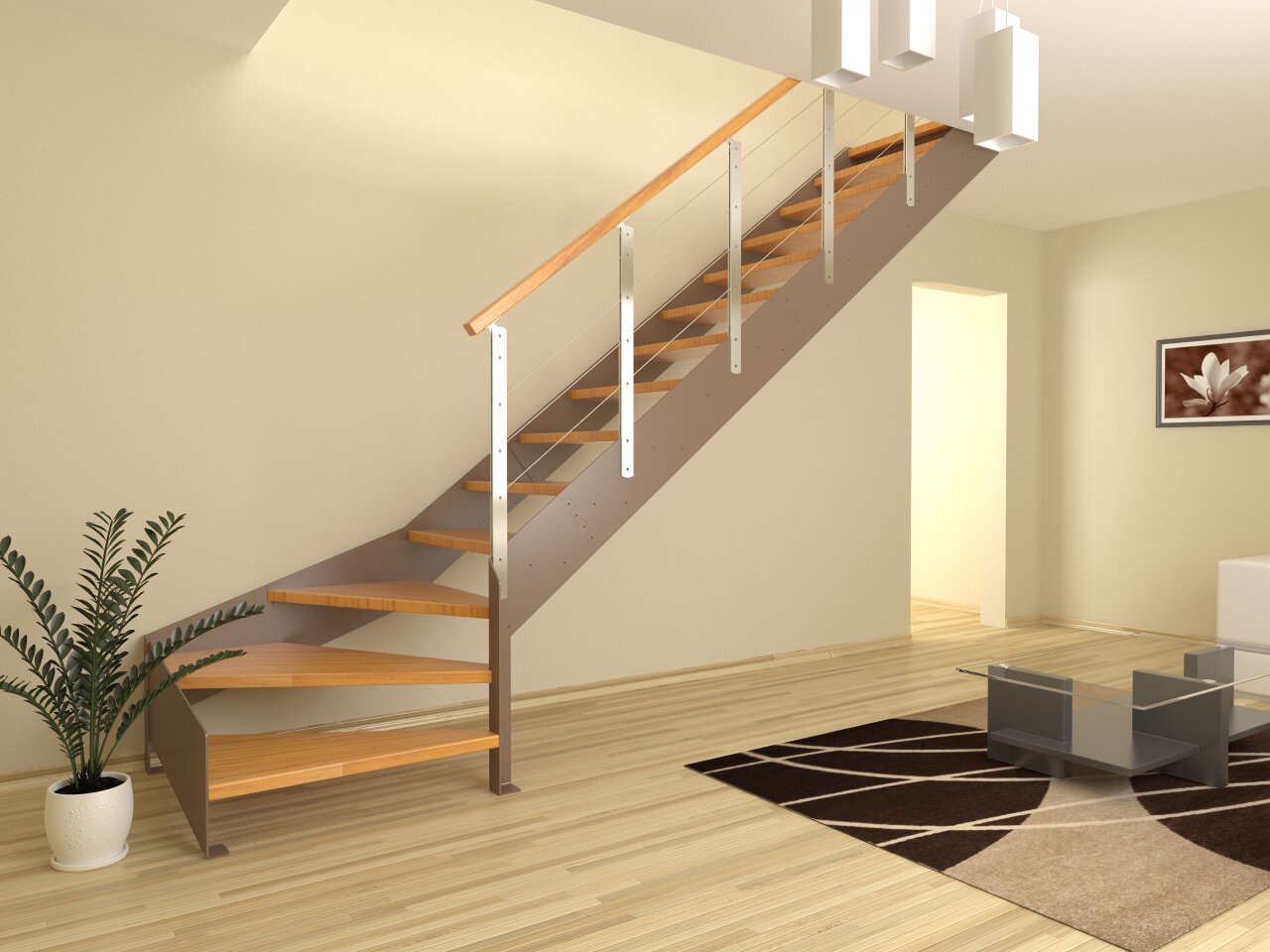 Маршевая лестница с несущим каркасом из сосны и ступенями из сосны, бука или берёзы. Ширина до 900мм, высота, 2,9м. Изготавливается с прямыми и забежными ступенями. Марш прямой, 90 и 180 градусов. Два варианта ограждения.