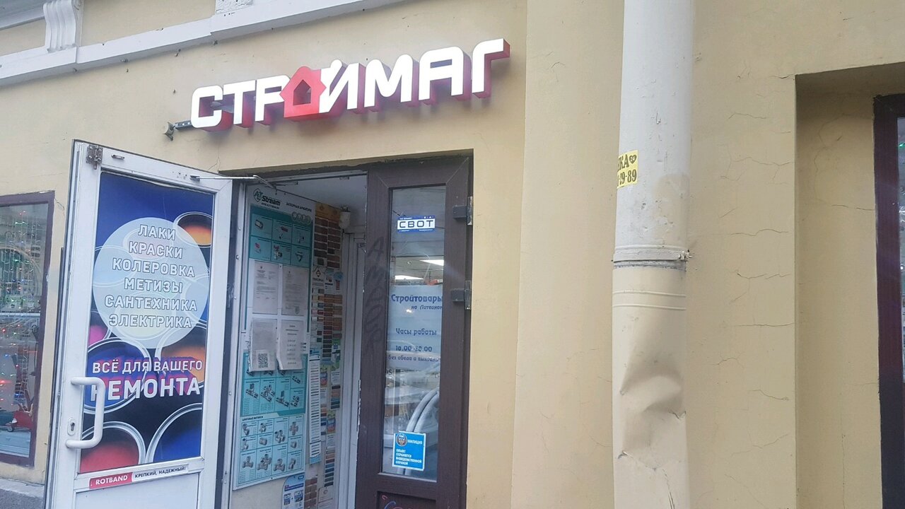 Строймаг — строительный магазин в Санкт-Петербурге, расположенный по адресу: Литейный проспект, 46. Ассортимент включает люки, материалы для колеровки и другие товары для ремонта и строительства. Работает ежедневно с 09:30 до 20:00. Контакты: телефоны +7 (984) 231-15-47, +7 (911) 025-30-08, +7 (921) 382-48-92, +7 (911) 814-92-94. Подробнее на сайте: (https://stroymag-v-centre-spb.ru/).