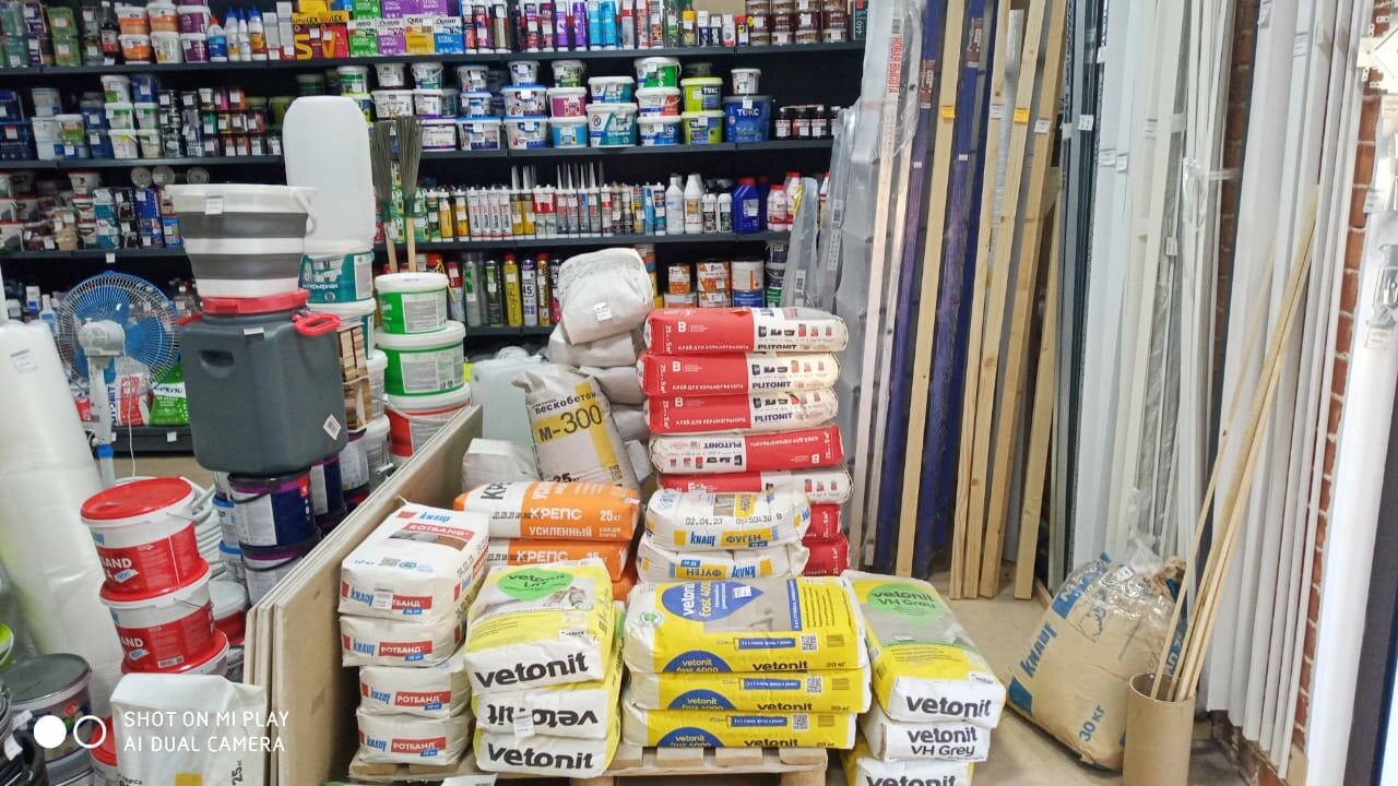 Хороший небольшой строительный магазинчик. Есть и трубы и краны и смеси для ремонта, много всего другого, надо спрашивать! Пленки, швабры, скотчи и прочее, выбор есть.