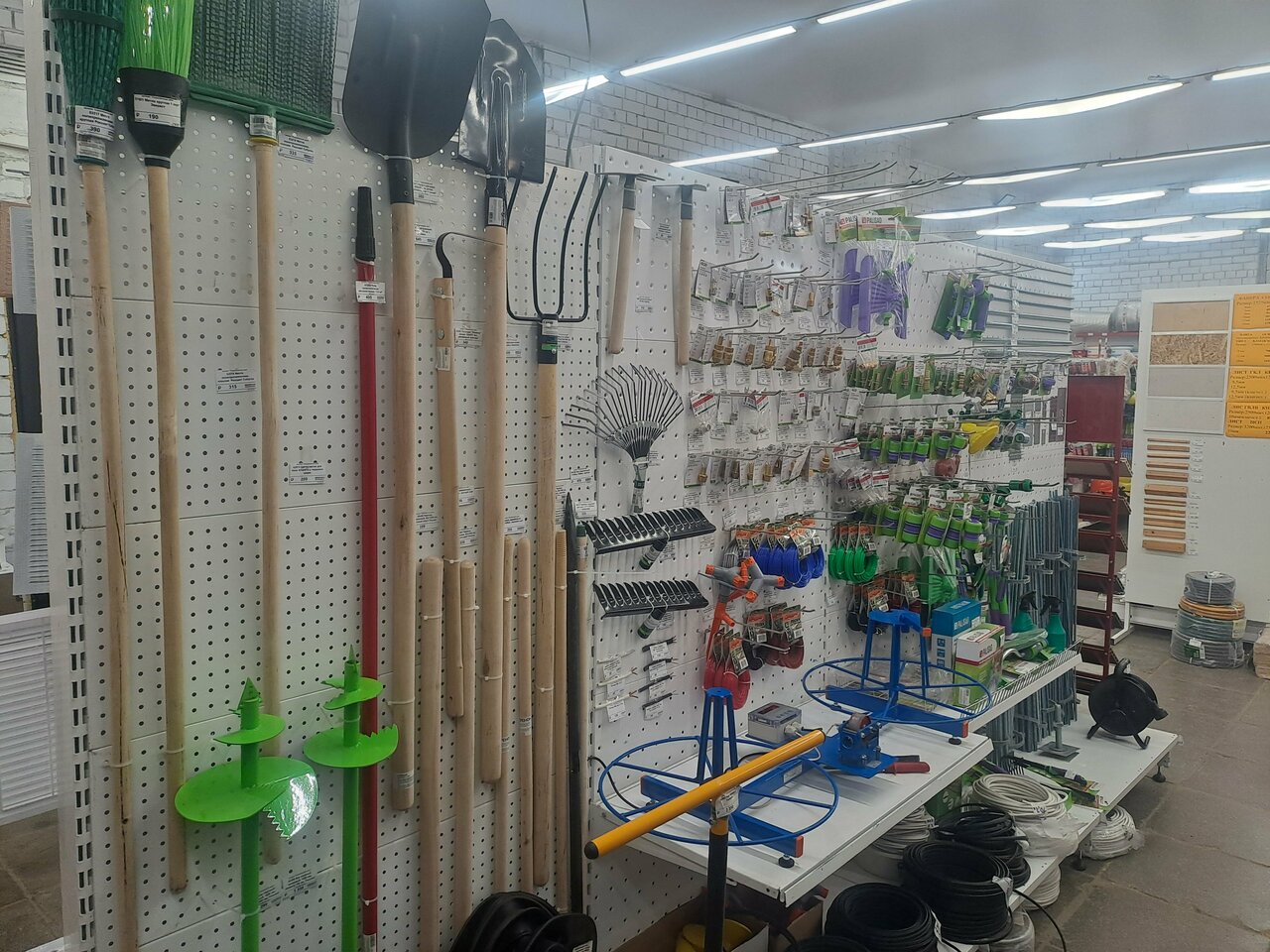Много строительного материала, есть электро инструмент. Очень большой выбор деревянных изделий, есть профильные трубы, брусчатка. Крепёж тоже присутствует, сантехнические изделия.