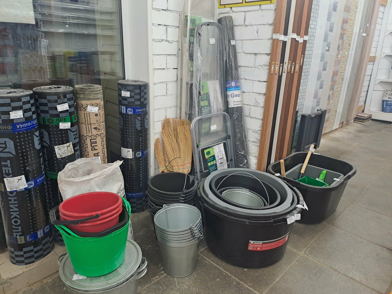 - Большой выбор строительных материалов (пиломатериалы, профильные трубы, брусчатка, крепёж, сантехника)