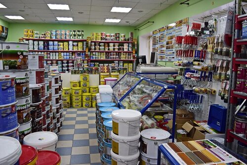 Краска тут в большом количестве продается, есть колеры для смешивания, у продавца можно всегда поинтересоваться насчет того, что купить из ассортимента.