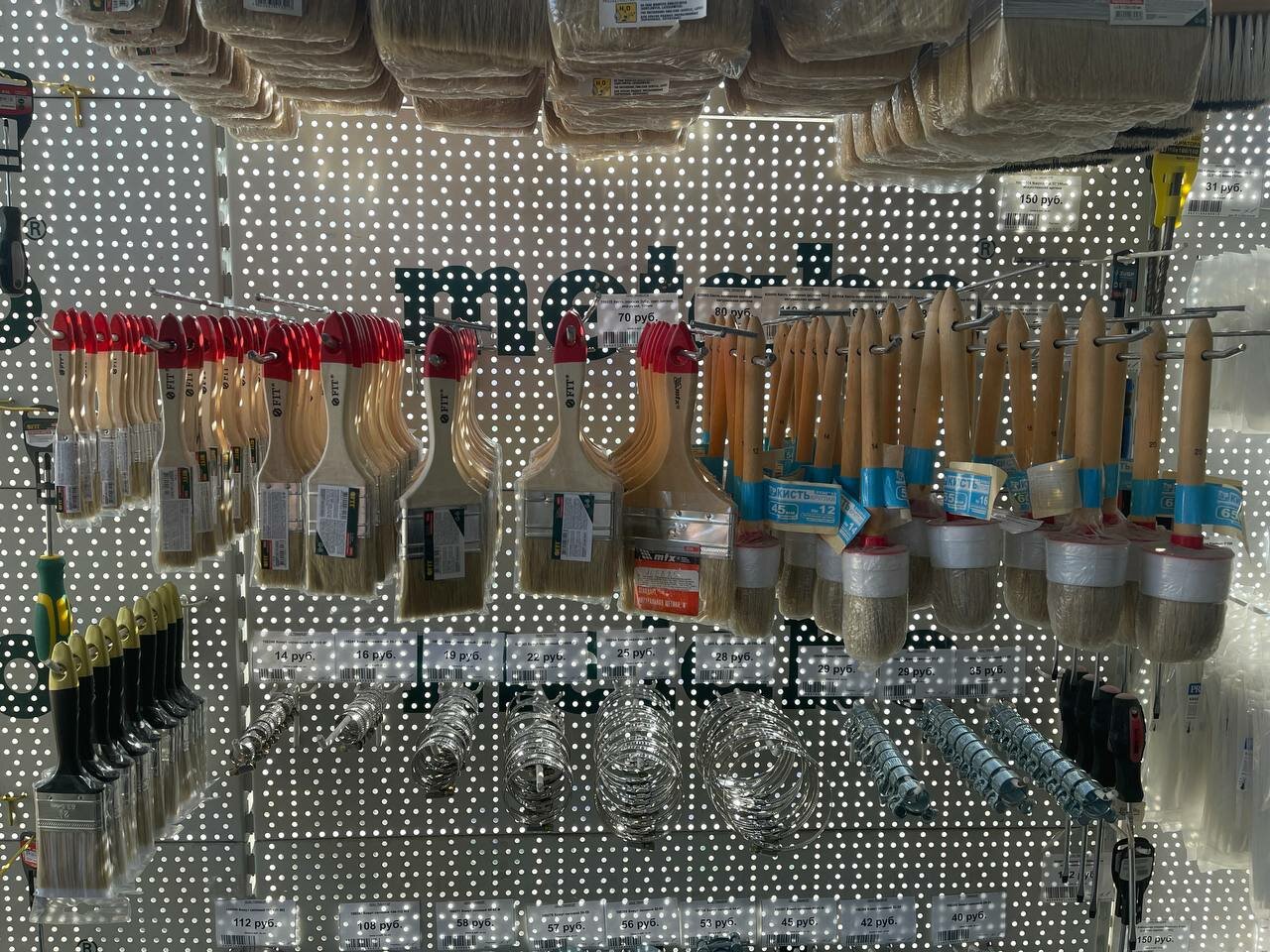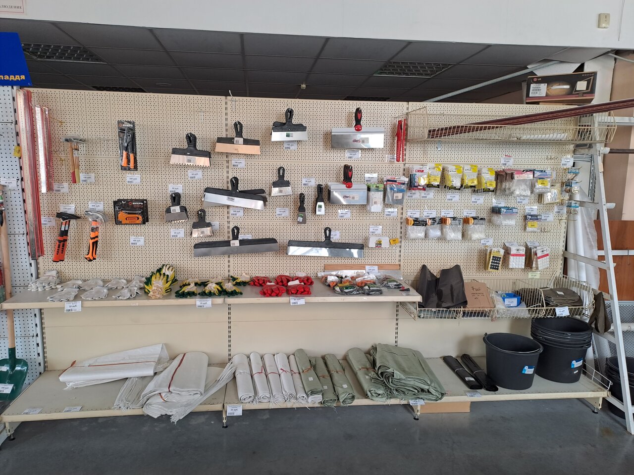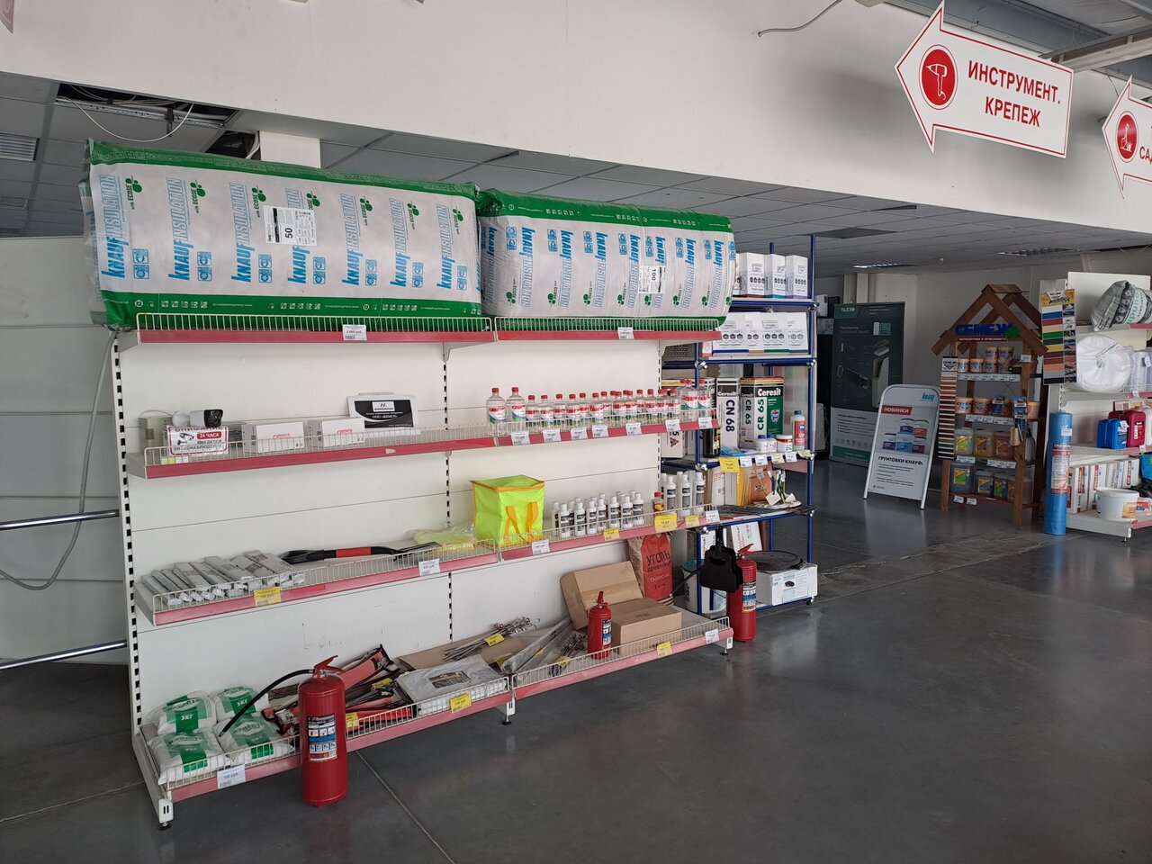 Все сухие смеси, лакокрасочные изделия просрочены,минимум на год, максимум на 4 года. Ценники и цены на украинском языке. Чаще вообще нет ценников. Бардак.