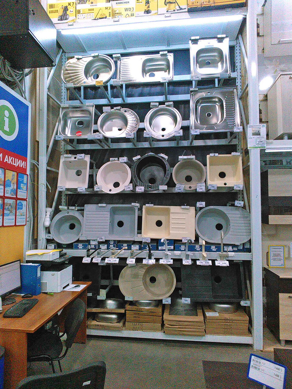 Вроди бы все нормально. Практически все есть. Но когда начинаешь искать определенную вещь, это мрак. Все в разброс, бардак в основном везде. Работники не профессиональны, к тому же их никогда нет на месте. Приходится бегать искать. Бывали случаи, что тяжелый товар приходилось таскать самому, и через кассу. Потому что, видите ли, на складе такого товара нет. Многие товары не пробиваются на кассе, и клиенту приходится самому бежать и менять. Хотя это обязанность магазина и его персонала. Одно радует, не грубят, но тупо разводят руками
