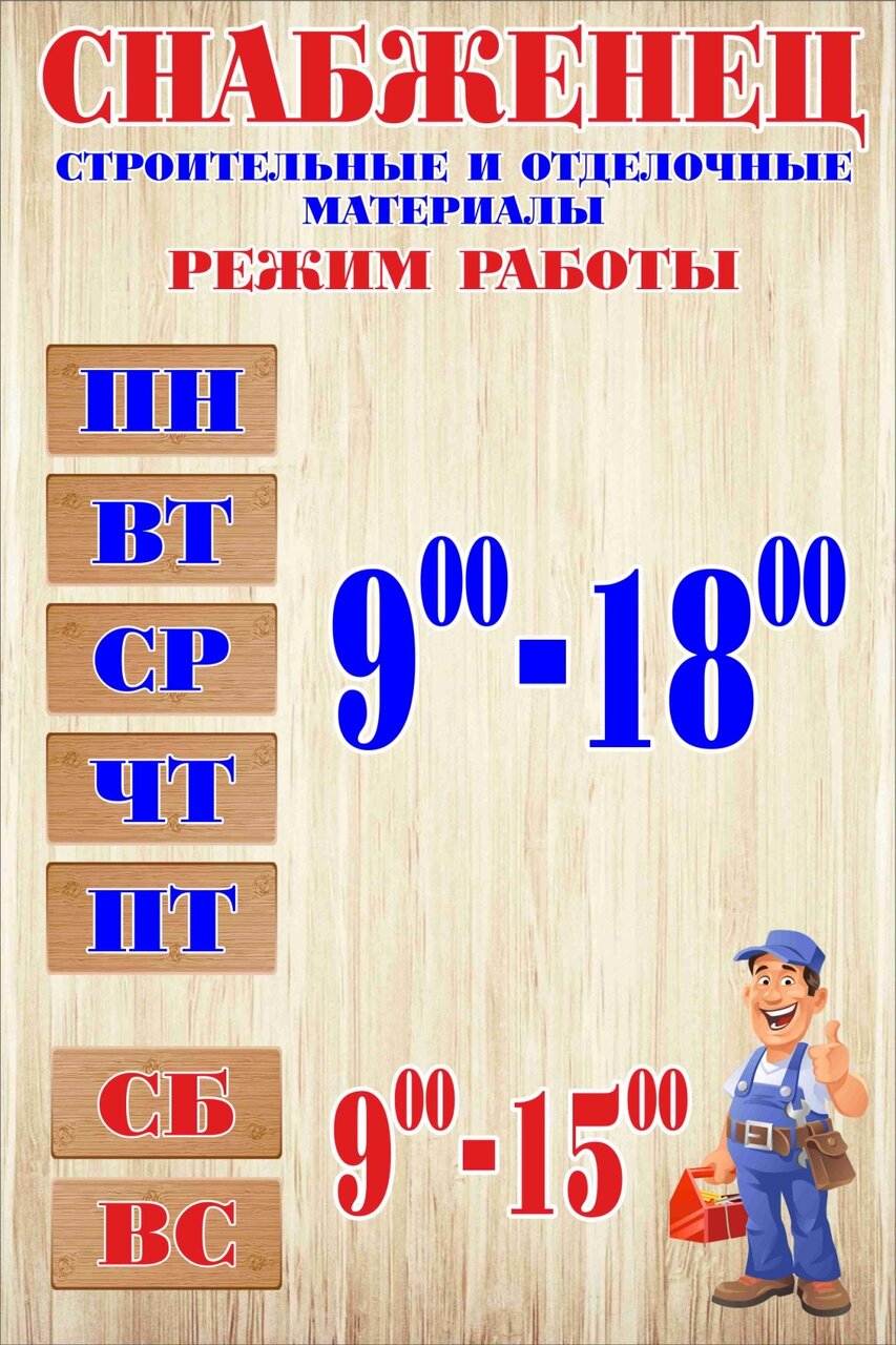 Снабженец — строительный магазин в Шуе, расположенный по адресу: ул. Кооперативная, 4. Ассортимент включает материалы, инструменты и товары для строительства, ремонта и отделки. Режим работы: пн-пт 09:00–18:00, сб-вс 09:00–15:00. Контактный телефон: +7 (910) 686-41-04.
