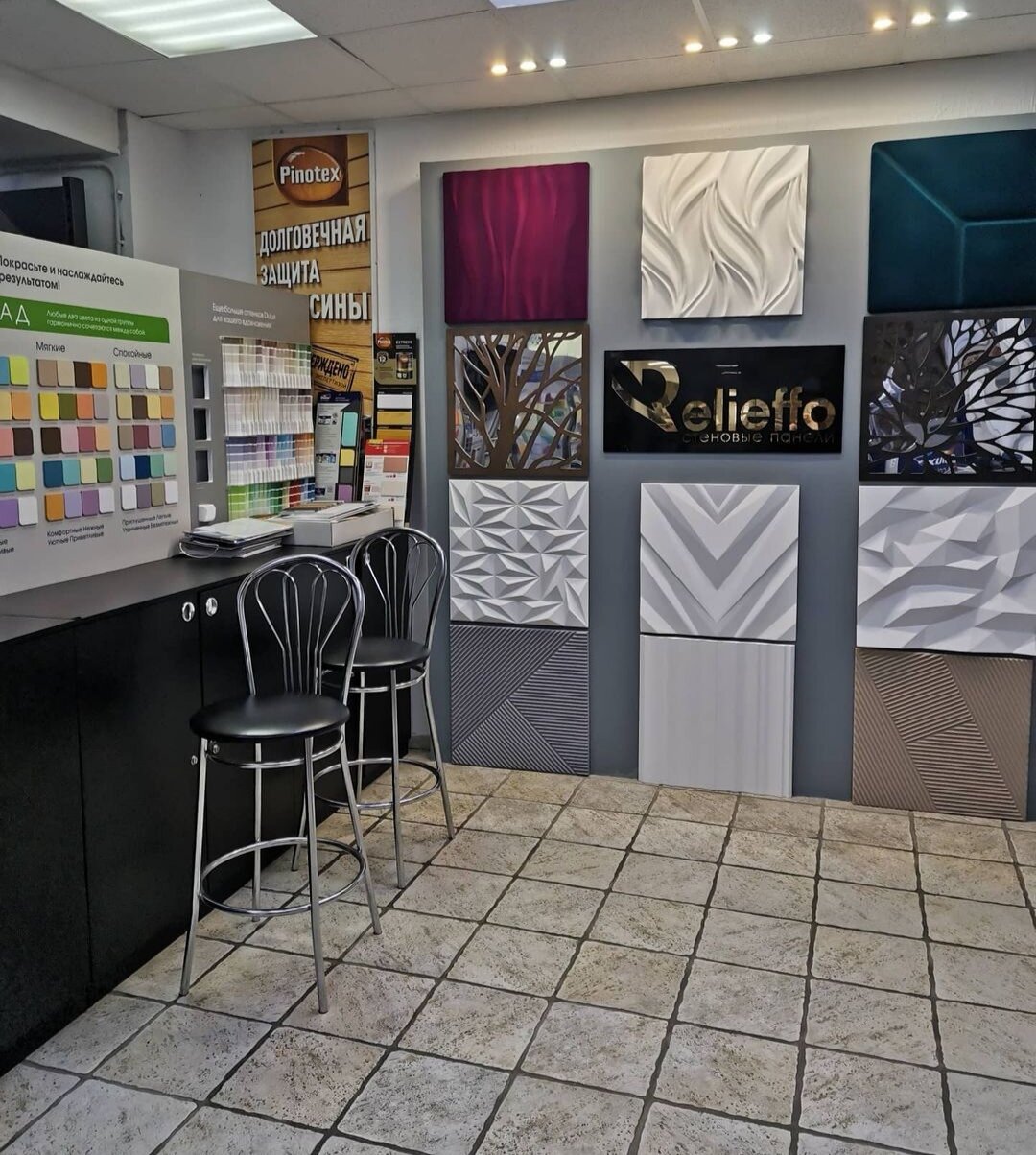 - Много готовых образцов декоративных штукатурок; Дружелюбная атмосфера без давления на покупателей; Большой выбор материалов (лаки, краски, декоративные штукатурки, молдинги, плинтуса, инструменты); Квалифицированные и приветливые сотрудники; Наличие редких товаров (полиуретановые молдинги, карнизы)