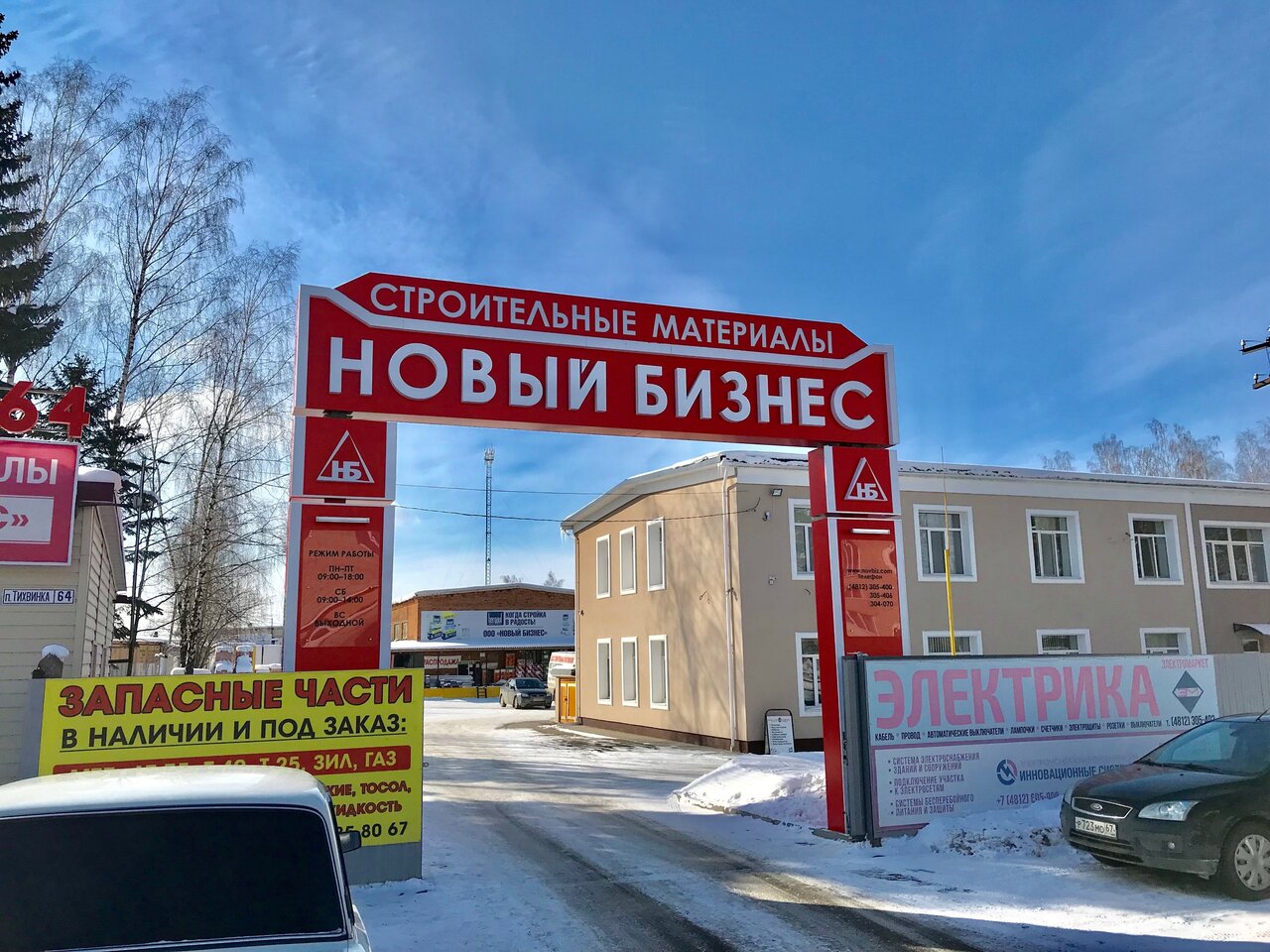 Строительный магазин «Новый бизнес» находится в Смоленске, по адресу: посёлок Тихвинка, 64. Магазин предлагает широкий ассортимент строительных и отделочных материалов, включая амбарную доску, газобетон, ЦСП, люки, мраморную крошку, лепнину из полиуретана и стеновые панели.