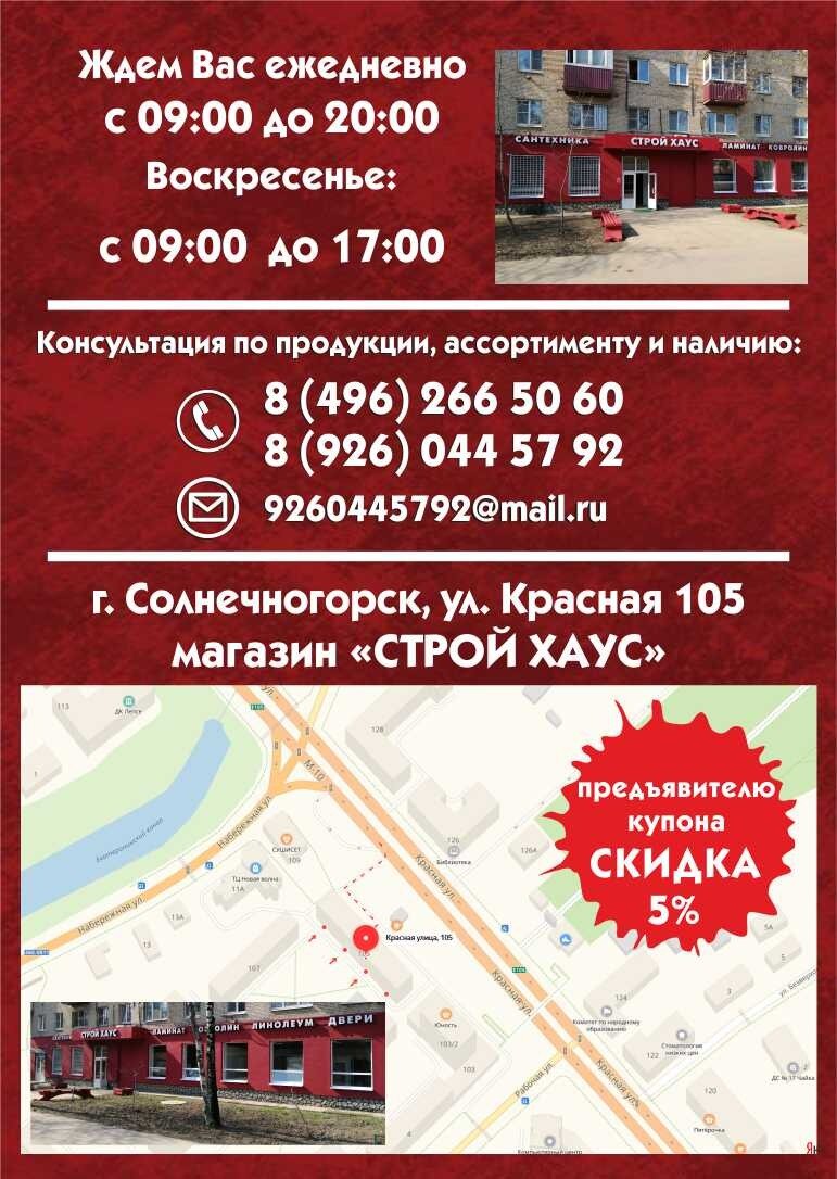 Строй Хаус в Солнечногорске по адресу Красная улица, 105, помещение 1: каталог товаров, официальный сайт, цены, режим работы, отзывы посетителей, номер телефона.