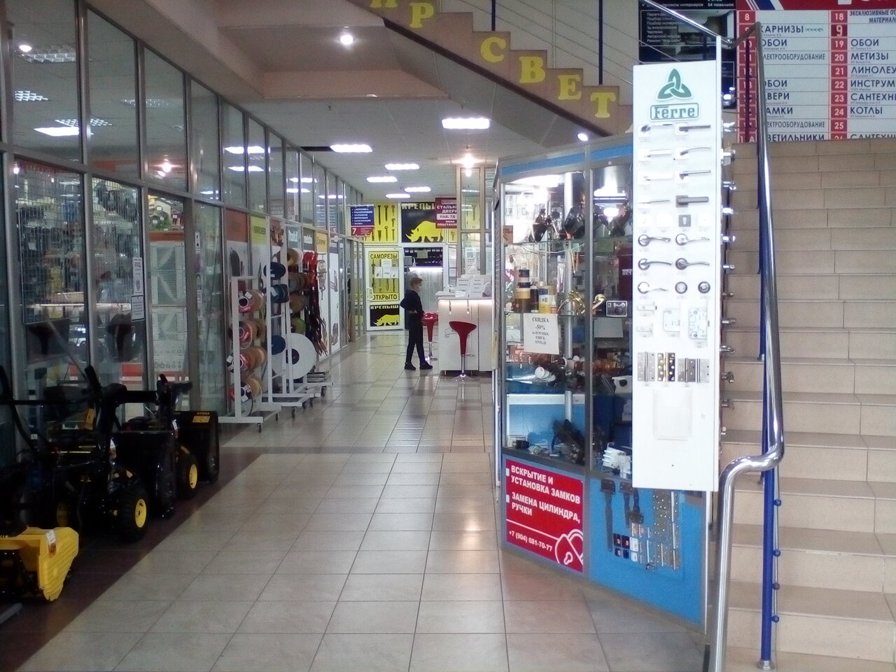 - Много магазинов в одном месте (сантехника, электрика, освещение и др.)