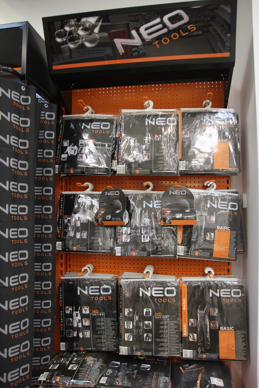 Прексный выбор лкм немецкого бренда Caparol, малярного инструмента Storch, малярные аппараты для нанесения Wagner и даже есть спец одежда для работы Neo Tools