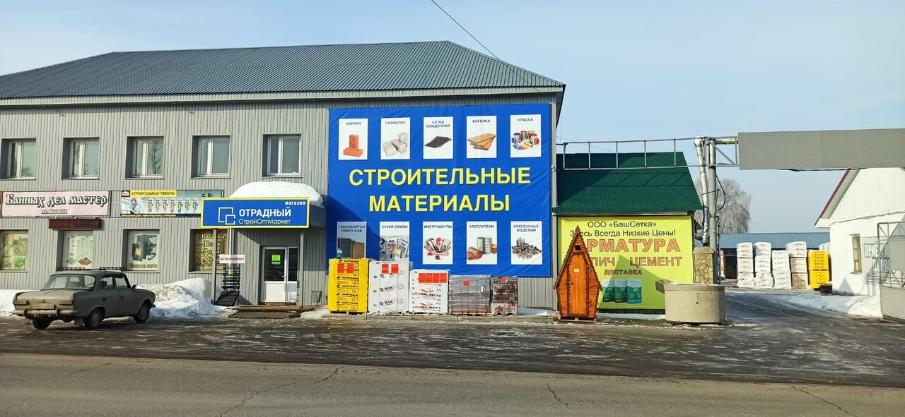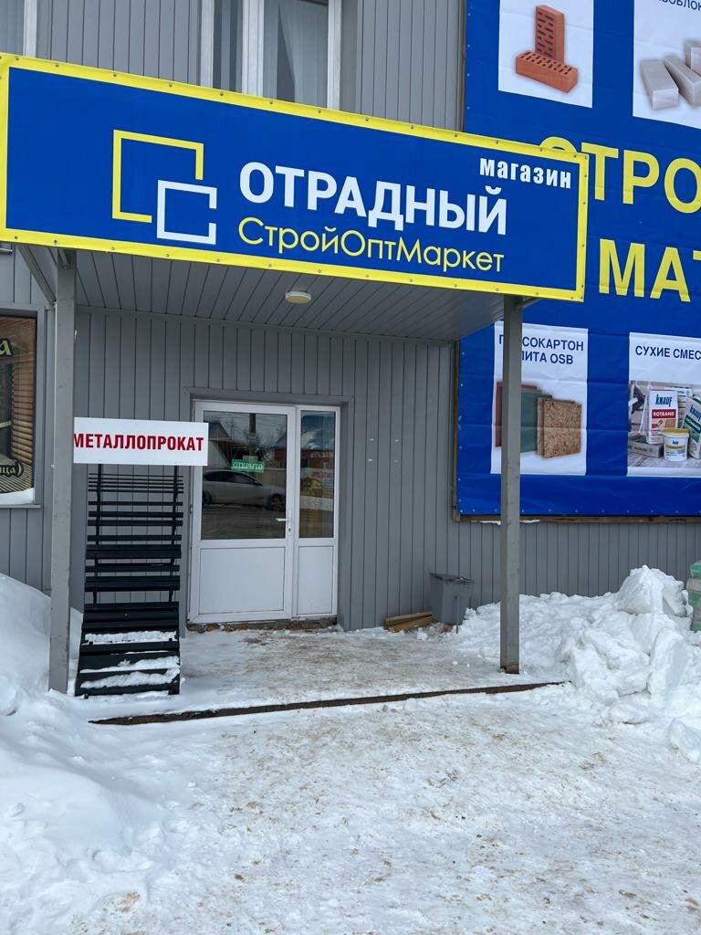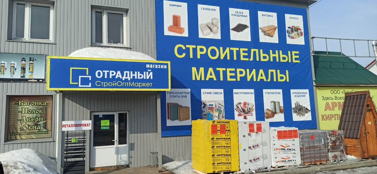 Отрадный — строительный магазин в Стерлитамаке, расположенный по адресу: Оренбургский тракт, 26А, 1 этаж. Ассортимент включает строительные материалы, инструменты и товары для ремонта. Режим работы: пн-сб 08:00–19:00, вс 08:00–18:00. Контакты: сайт (http://stroyoptmarket.com/), телефоны +7 (962) 523-22-53, +7 (937) 163-51-23, +7 (917) 779-75-77.