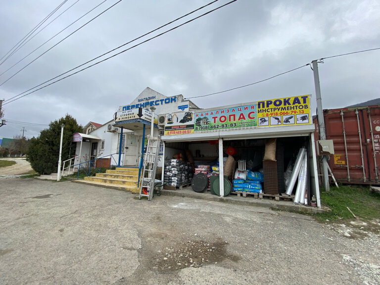 Строительный магазин «Перекресток» находится в посёлке Сукко по адресу: ул. Советская, 183Б. Магазин работает ежедневно с 08:00 до 19:00, предлагая широкий ассортимент строительных материалов, инструментов и товаров для ремонта. Контактные телефоны и сайт не указаны.