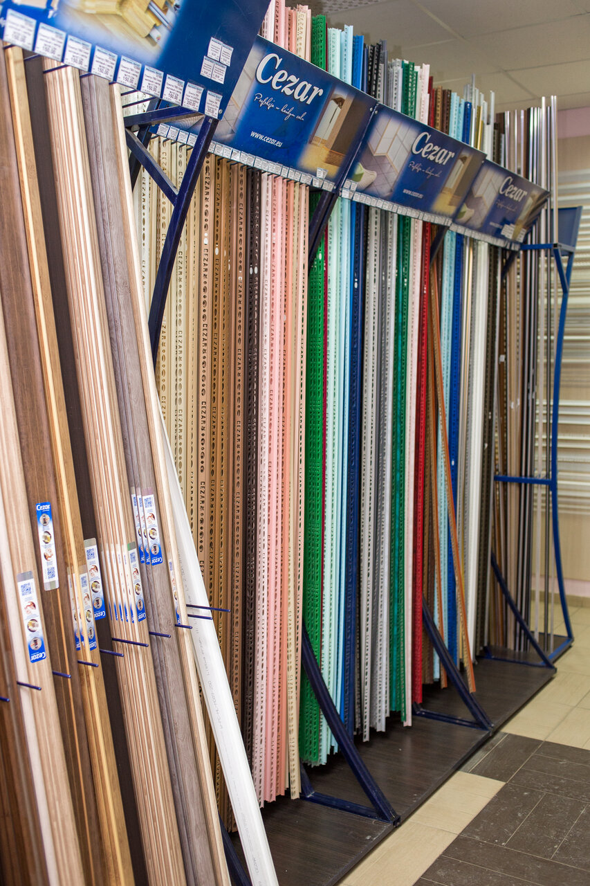Большой выбор строительных материалов, от крепежей и болтов, до обоев и электрики. Помещение поделено на зоны, для удобства выбора товара