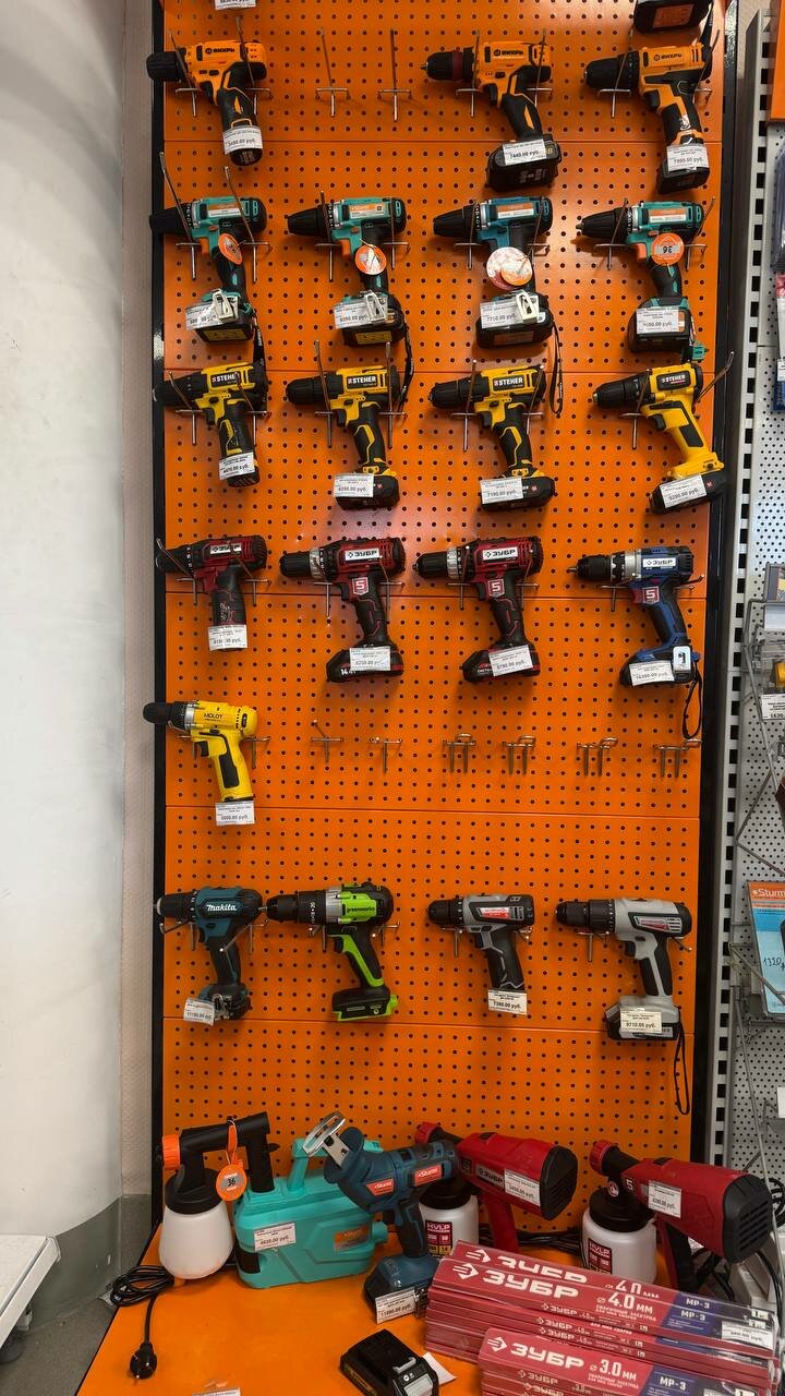 - Широкий выбор электроинструментов, метизов, сантехники и др