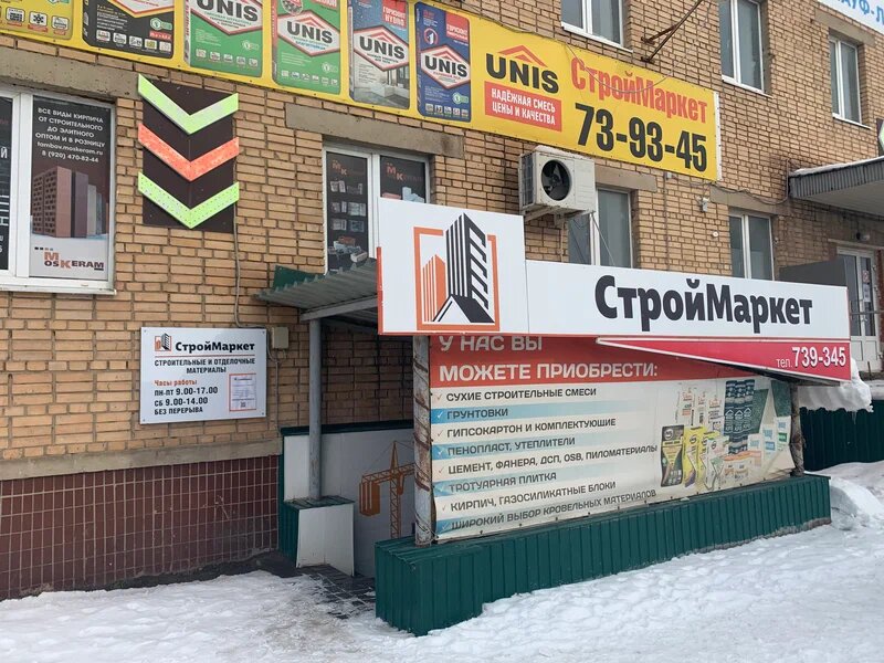 СтройМаркет — строительный магазин в Тамбове, расположенный по адресу: ул. Волжская, 69. Ассортимент включает материалы, инструменты и товары для строительства, ремонта и отделки. Режим работы: пн-пт 09:00–17:00, сб 09:00–14:00. Контакты: +7 (4752) 73-93-45 (выписка товара), +7 (4752) 73-93-68 (бухгалтерия). Подробнее на сайте: (http://stroimarket-tambov.ru/).