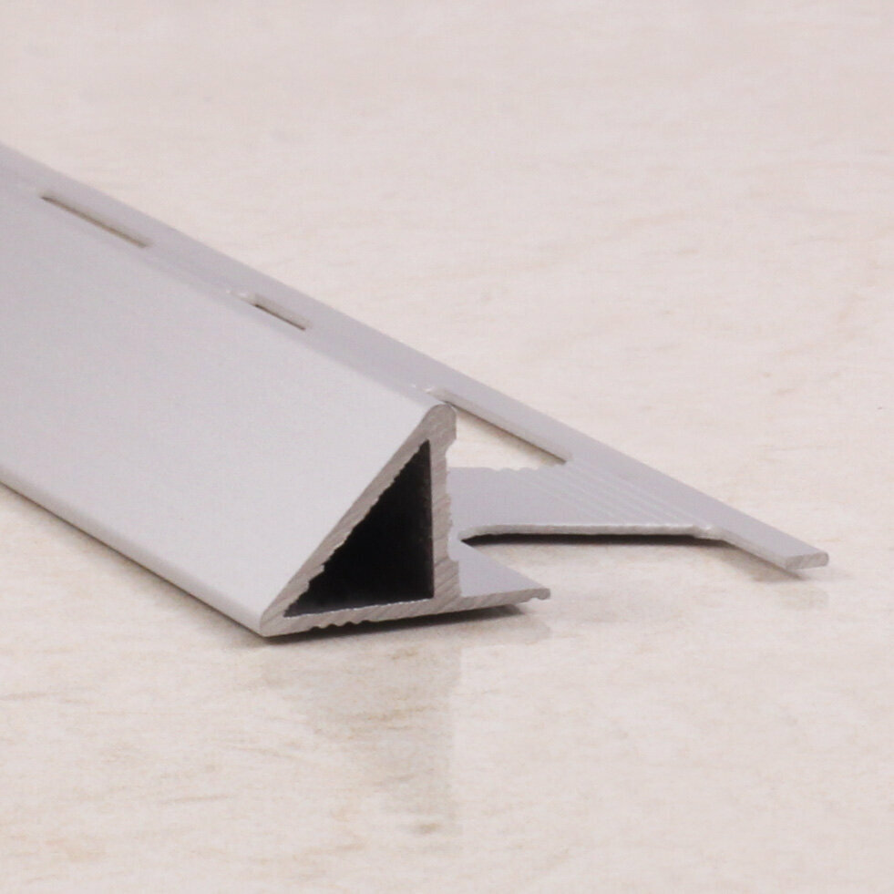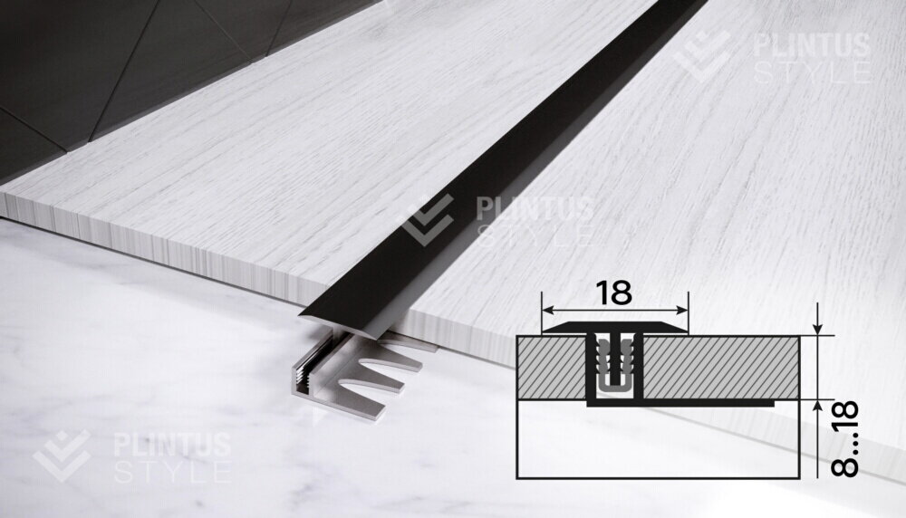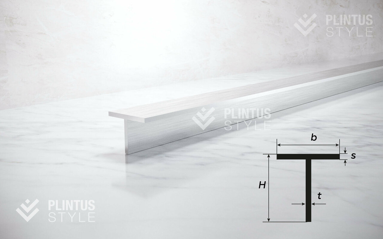 Стык алюминиевый Т-образный предназначен для маскировки монтажных зазоров, остающихся между двумя участками расположенных в одном уровне однородных либо различающихся напольных отделочных материалов.