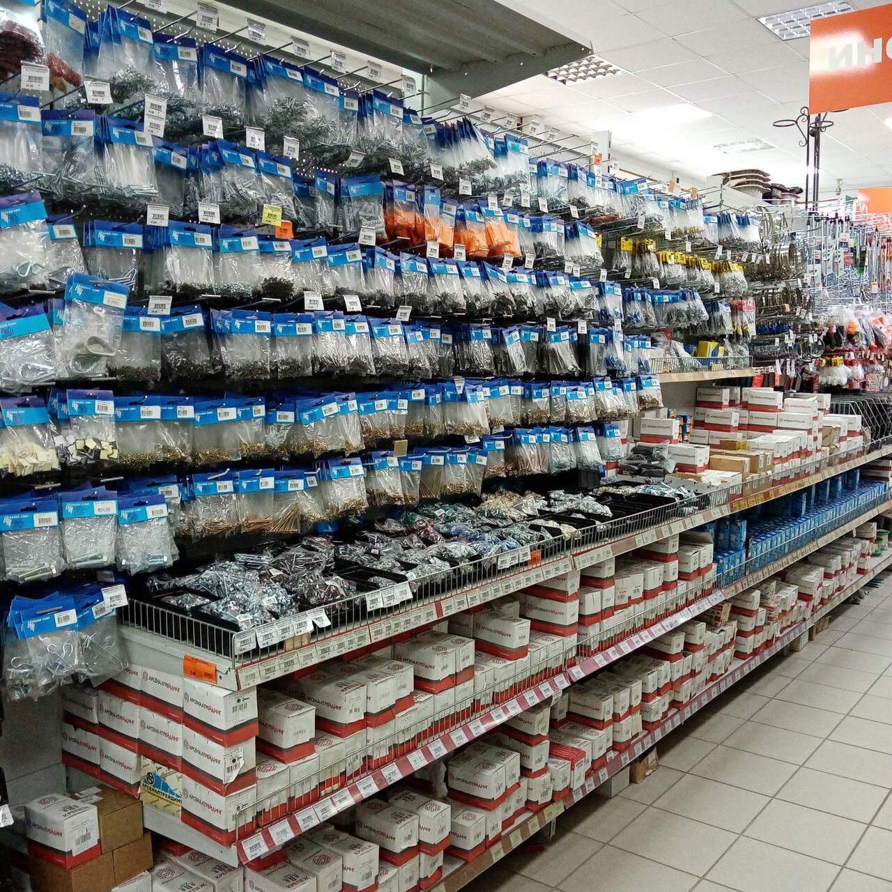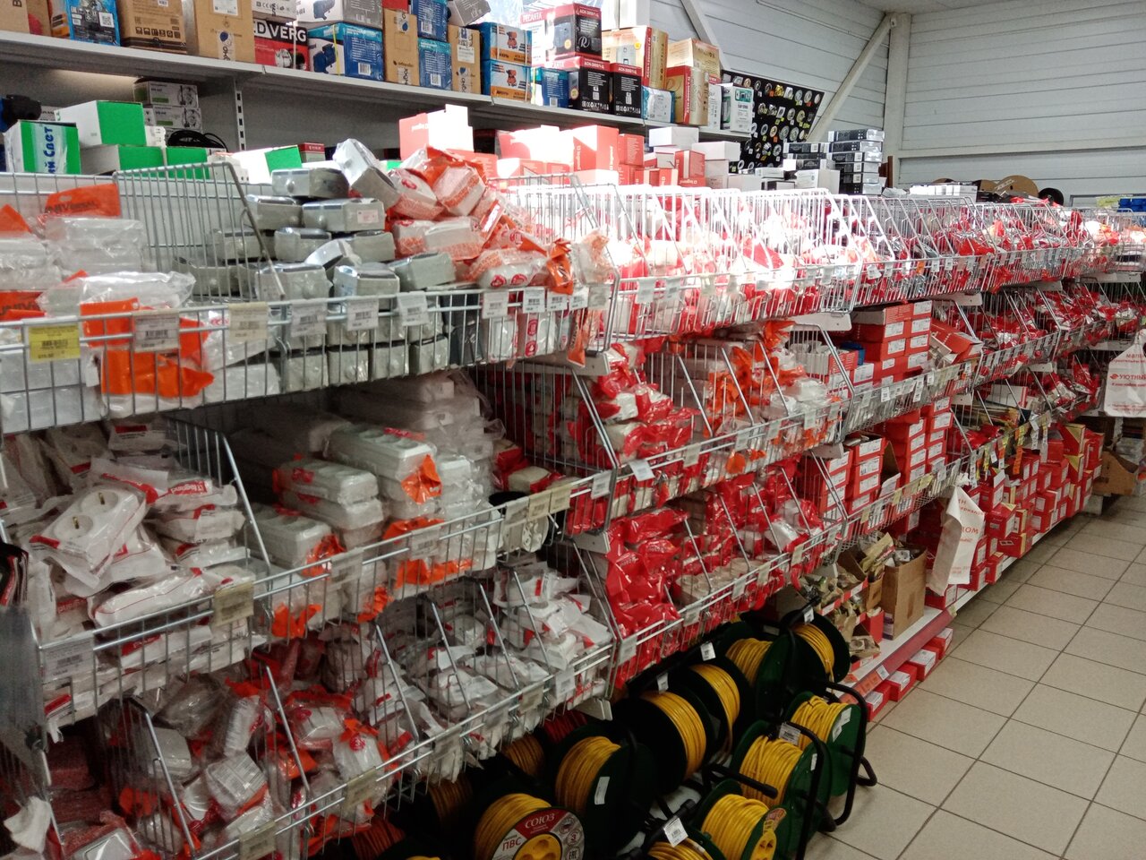 Большой выбор, есть всё . Электрика, сантехника, краски лаки грунтовки, саморезы клёпки болты . Металл, проф трубы ковка и многое другое. Всегда можно что нибудь найти.