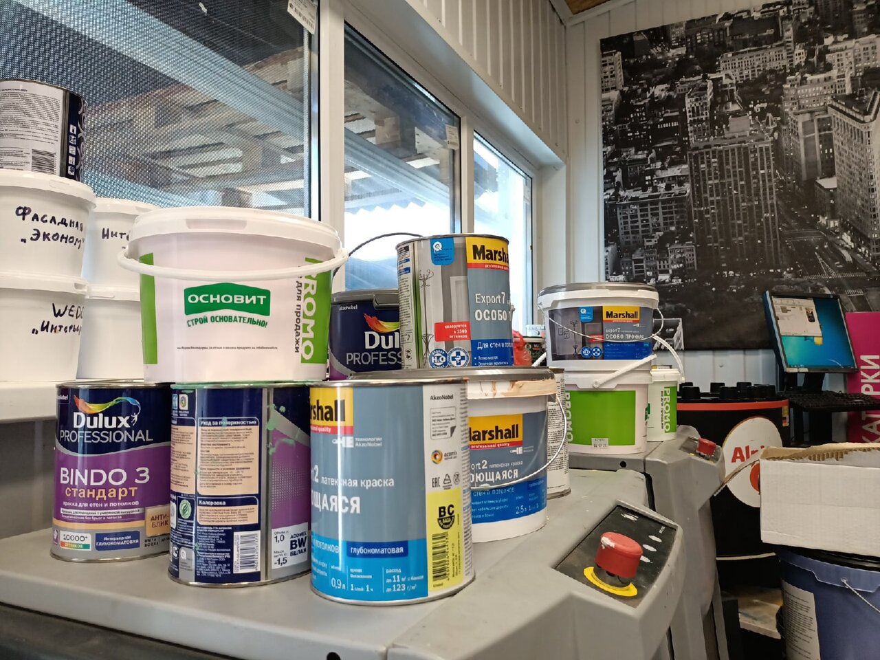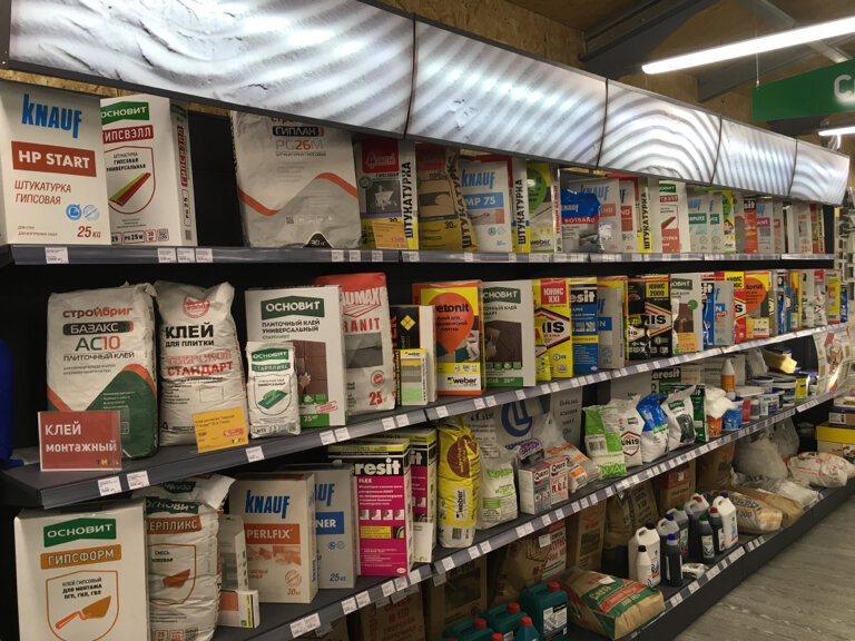 - Хороший выбор лакокрасочных покрытий и строительных смесей