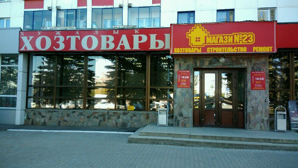 Магазин № 23 — строительный магазин в Уфе, расположенный по адресу ул. Рихарда Зорге, 37. Режим работы: пн-пт 09:00–20:00, сб-вс 09:00–19:00. Контактный телефон: +7 (347) 223-02-08. Ассортимент включает строительные материалы, инструменты и товары для ремонта.