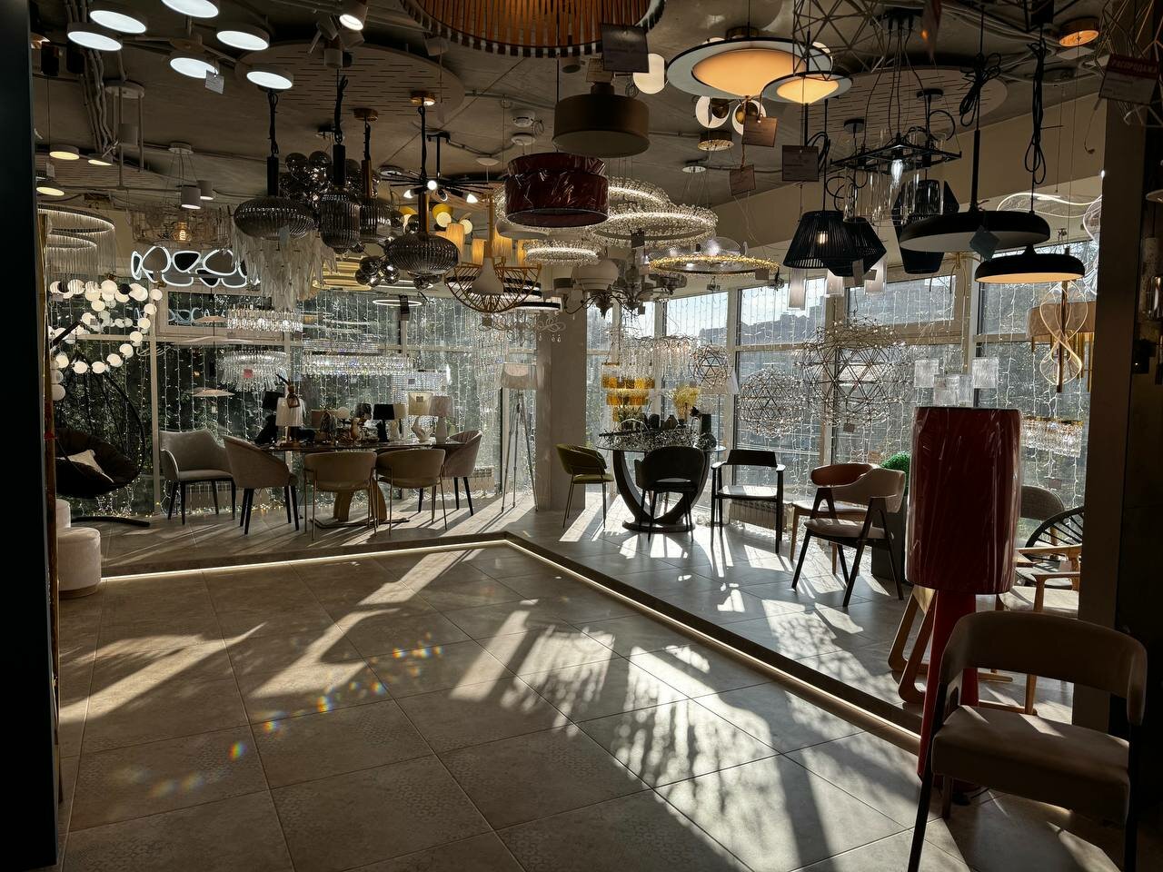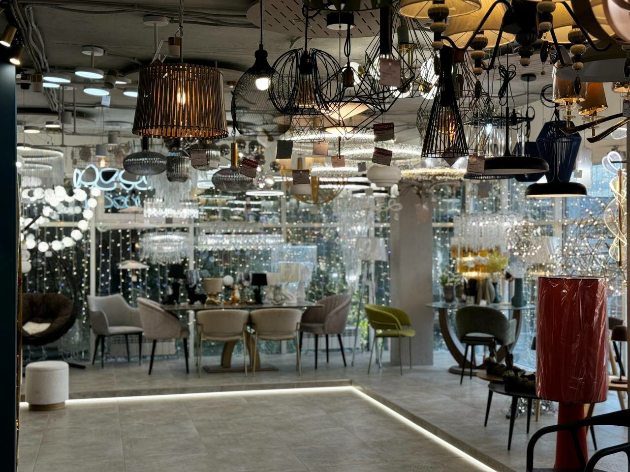 - Большой и разнообразный ассортимент (люстры, светильники, мебель, декор)