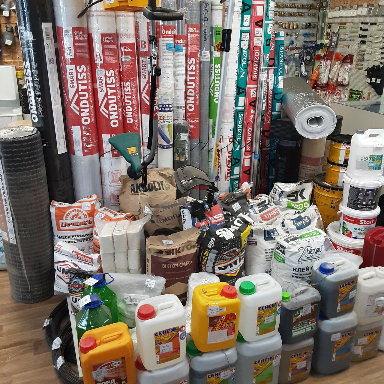 Есть практически всё для лёгкого ремонта на даче. Некоторые товары дешевле, чем в Мерлене!