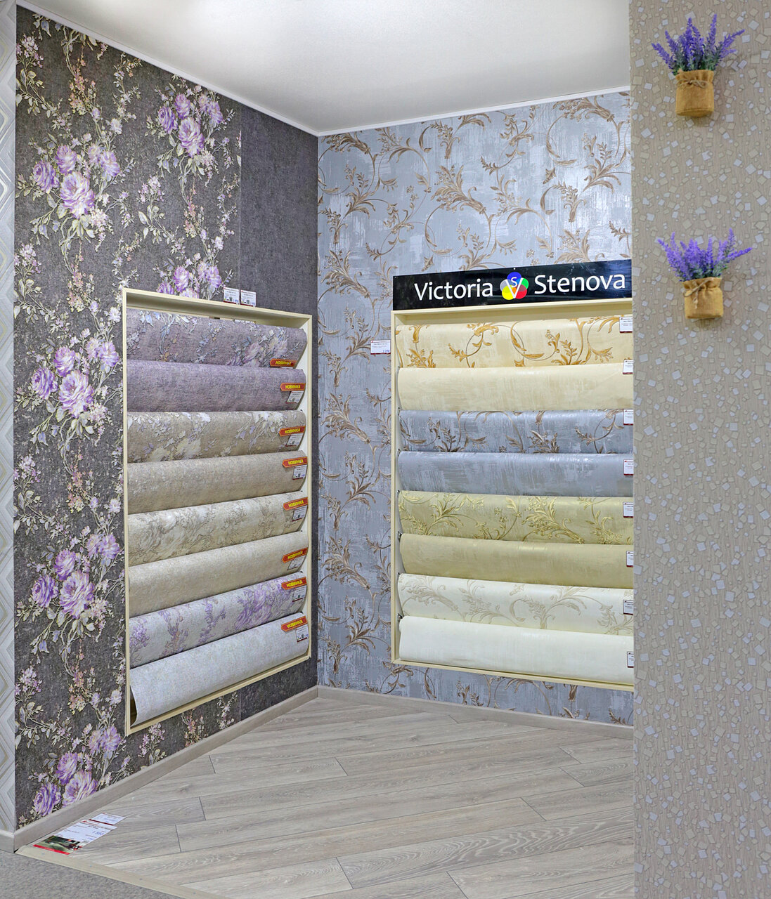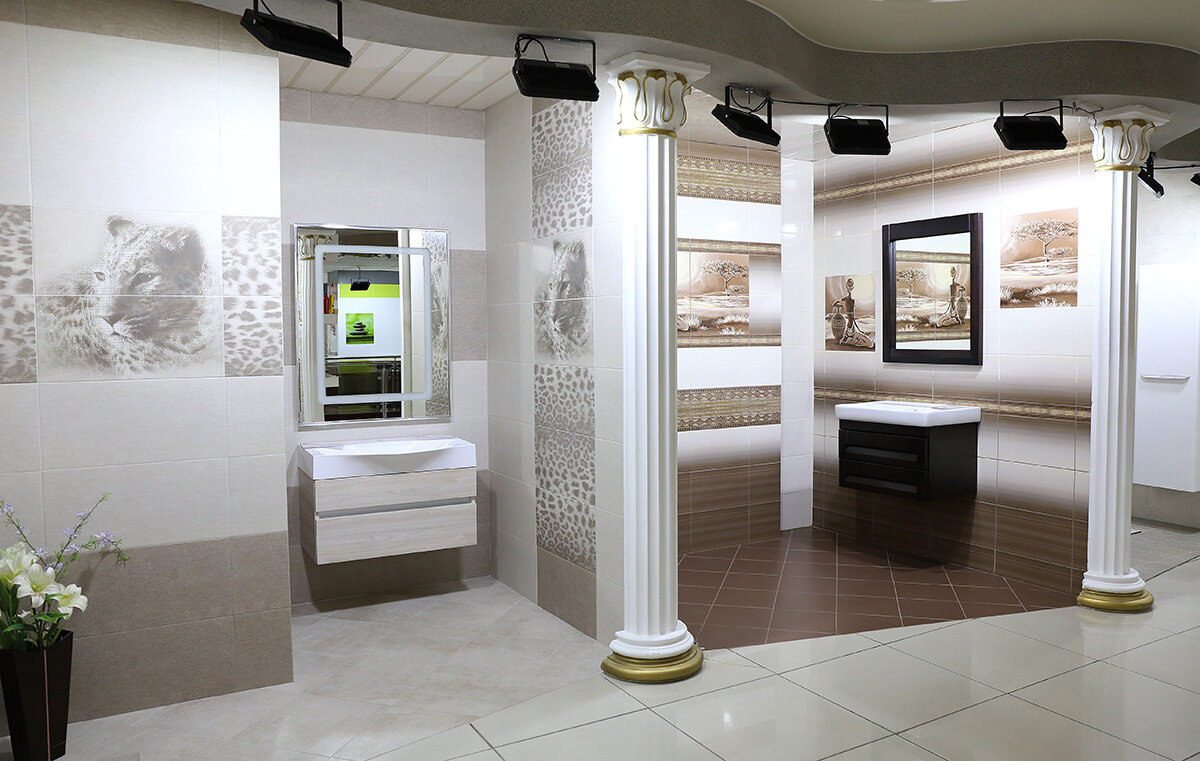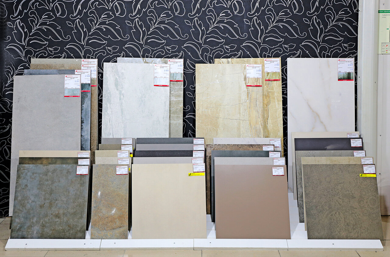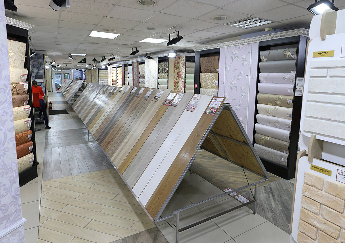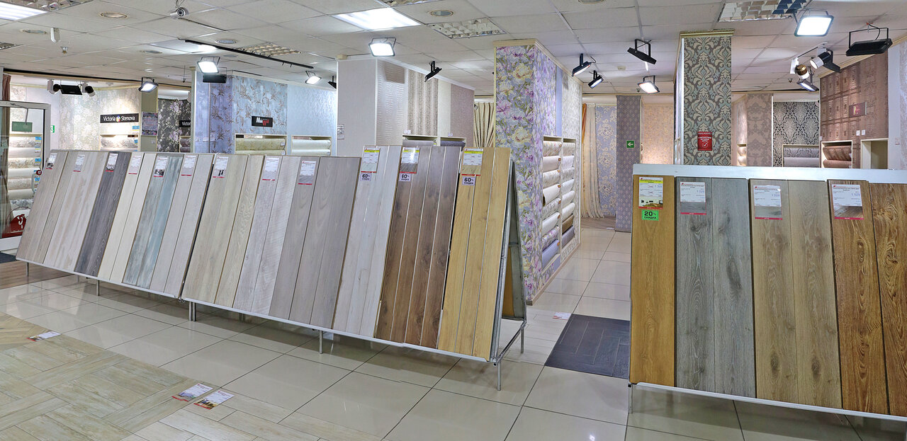 - Широкий выбор обоев, кафеля, паркета, сантехники, керамогранита