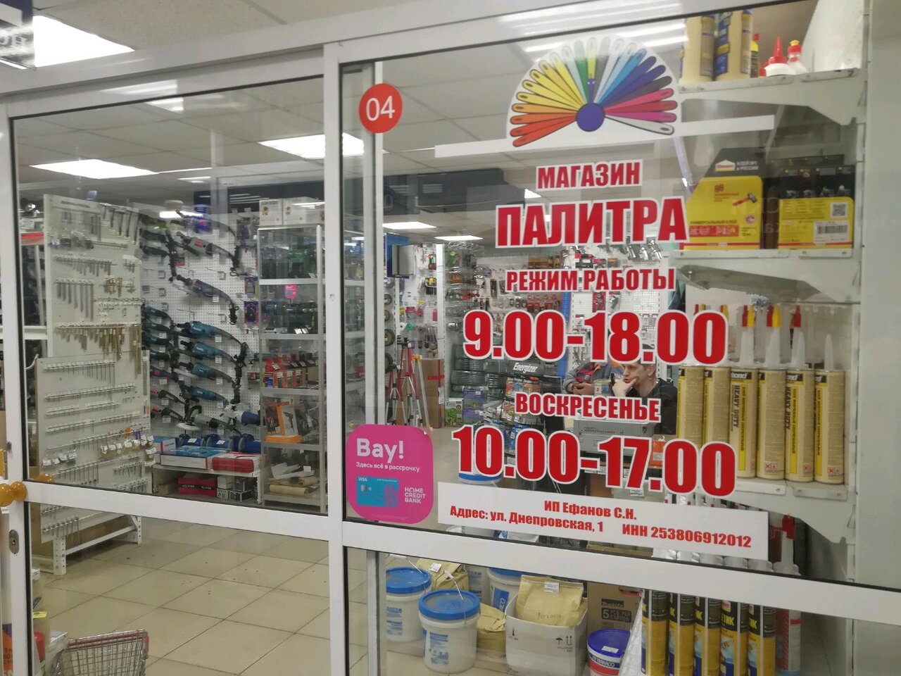 Строительный магазин «Палитра» во Владивостоке предлагает широкий ассортимент профессиональных инструментов и материалов для строительства и ремонта. Магазин расположен по адресу: ул. Калинина, 275Б, и работает с понедельника по субботу с 09:00 до 18:00, в воскресенье — с 10:00 до 17:00.