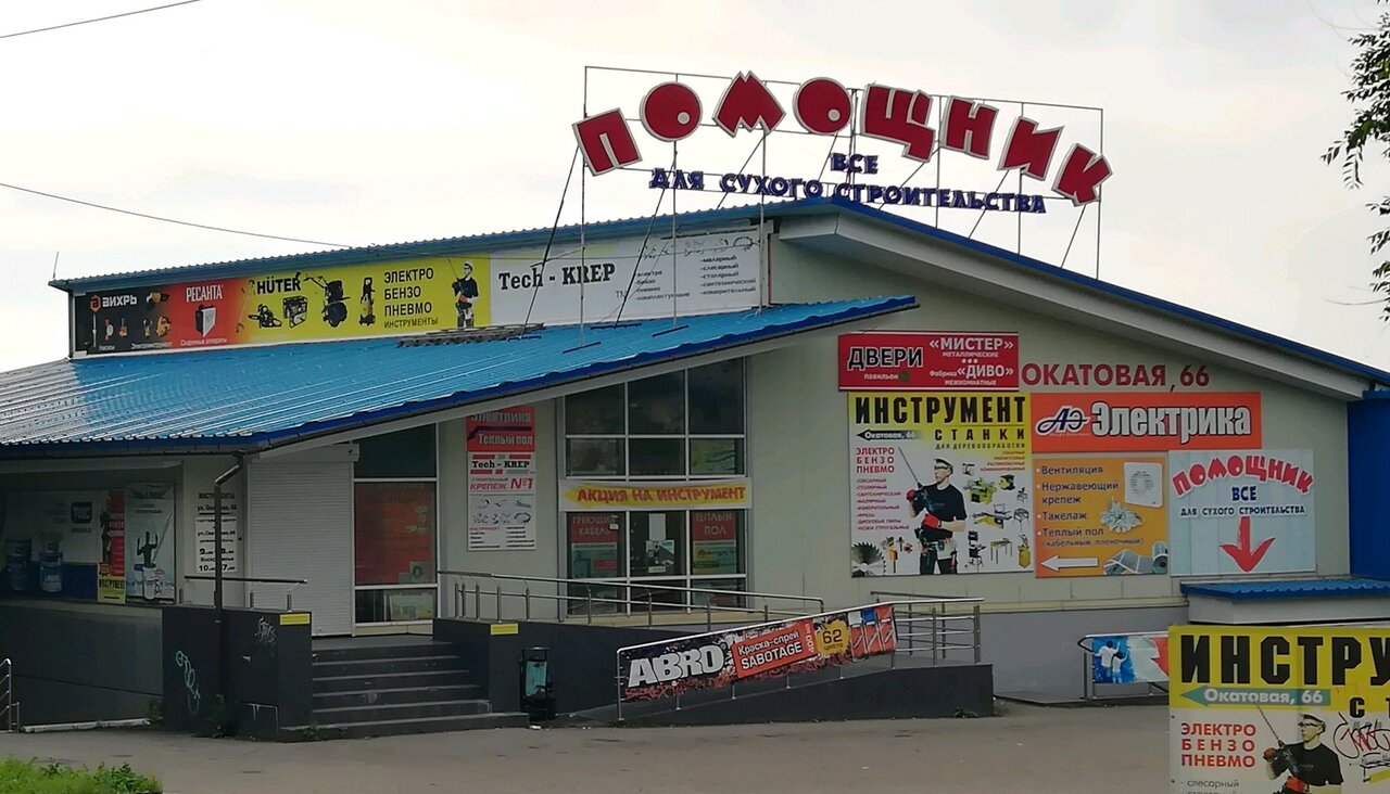 Магазин «Помощник» находится по адресу: ул. Окатовая, 66с3. Специализируется на продаже стройматериалов, включая газобетон, стеновые панели, а также предлагает услуги колеровки.