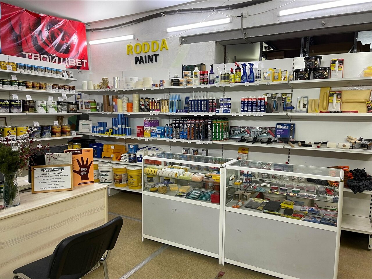 - Помощь в подборе краски; Возможность купить всё в одном месте; Большой ассортимент; Удобное расположение; Приветливый персонал