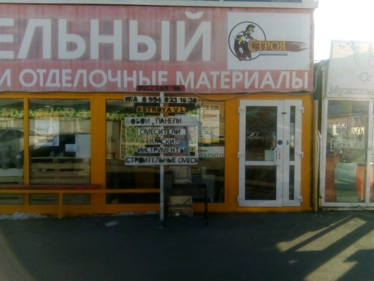Строя — строительный магазин во Владивостоке, предлагающий материалы, инструменты и товары для ремонта и отделки. Расположен по адресу: ул. Русская, 16Б. Работает ежедневно с 09:00 до 18:00. Контакты: +7 (423) 290-16-30, +7 (994) 023-16-30. Подробнее: (http://www.stroyavl.ru/).