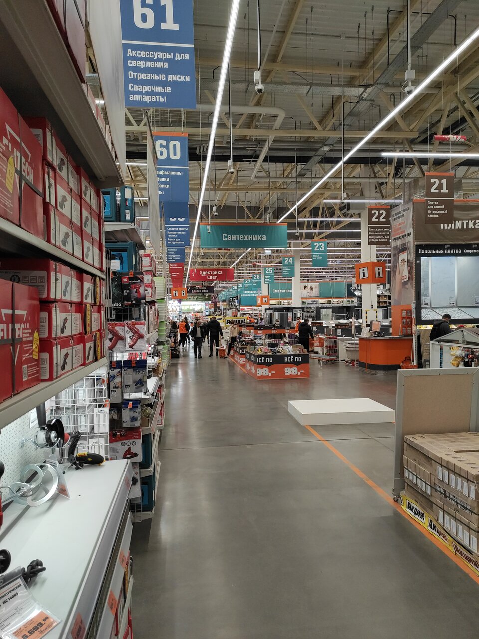 Товара море, цены лучше чем где то еще, скидки, карта клиента, вежливый персонал, очередь быстро двигается даже если она есть, гарантия и ремонт