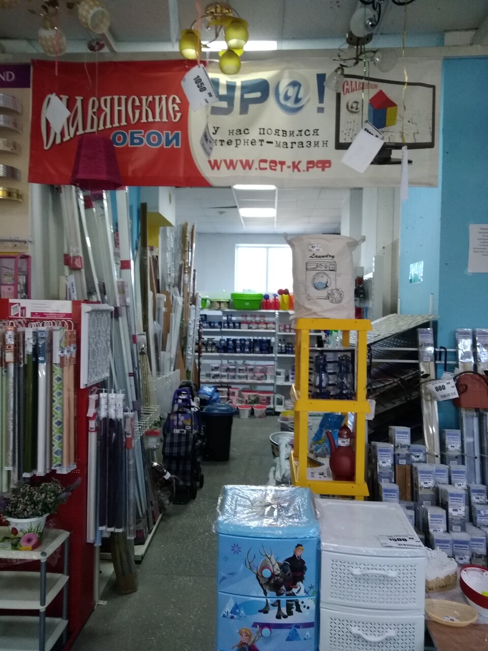 - Большой ассортимент (обои, плитка, светильники, посуда, хозтовары и др.)