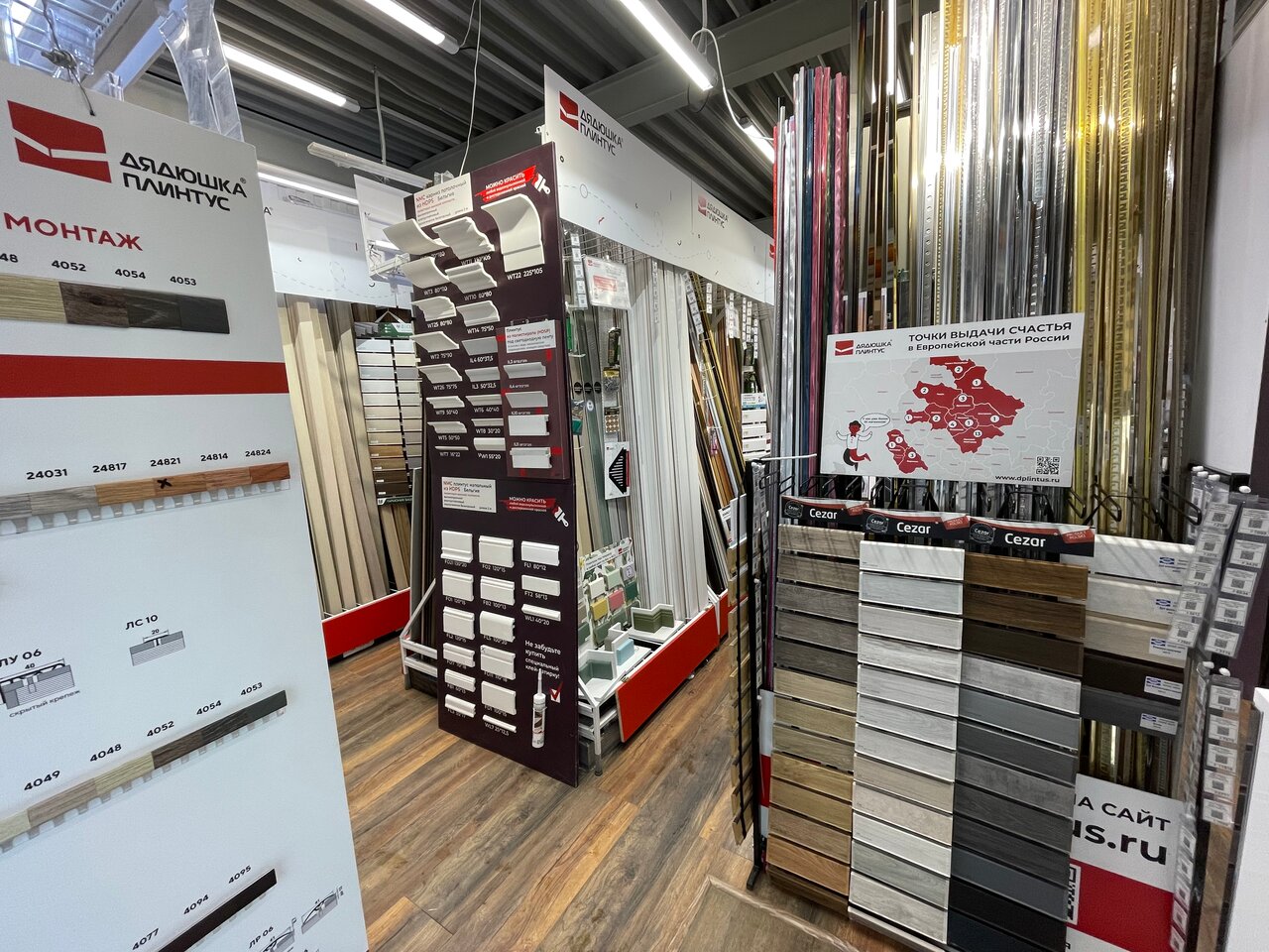 Широкий выбор плинтусов и комплектующих к ним, что есть не в каждом строительном магазине. Возможно найдёте там то самое что Вам нужно. Помимо плинтусов там так же продаётся прочая мелочевка для отделки. Однако сразу предупреждаю что ценник выше среднего будет. Продавцы компетентны и если что подскажут. Как то даже с доставкой возникли проблемы и продавец сам на своей машине привёз нам плинтуса. Не знаю работают ли сейчас те ребята но не давно было так.
