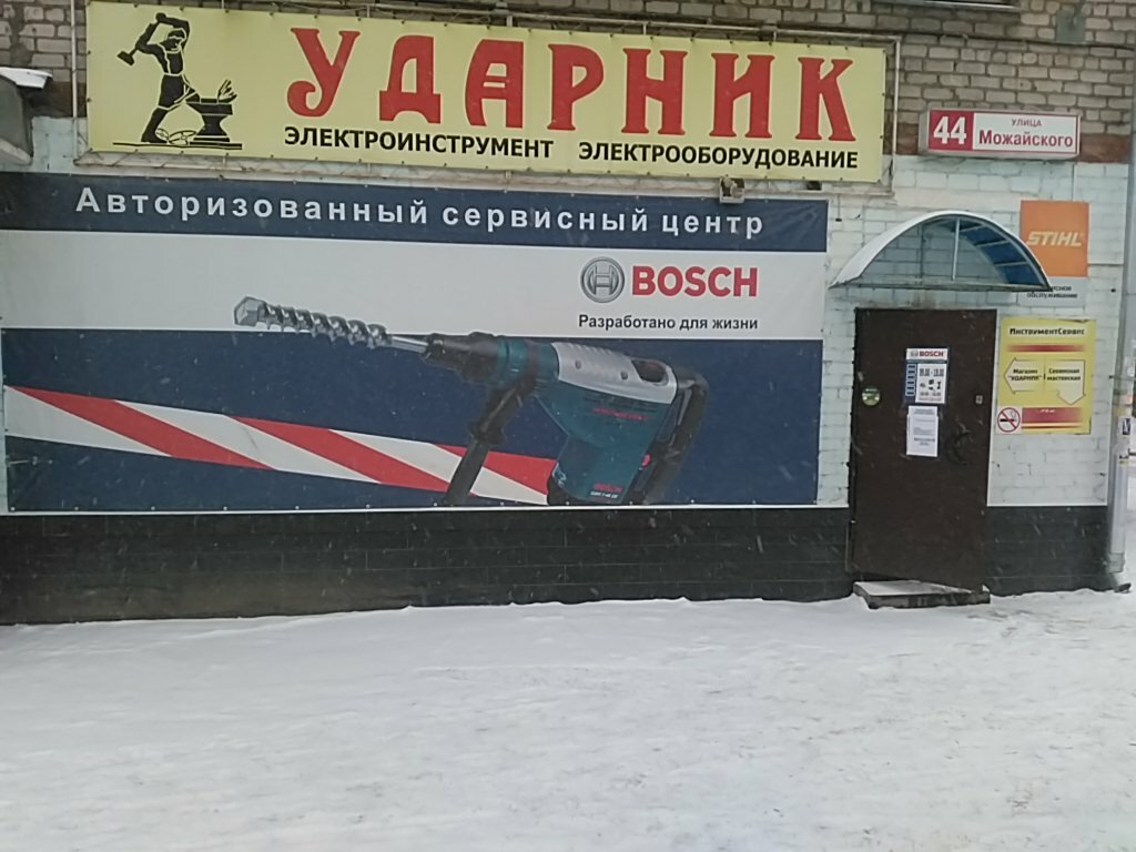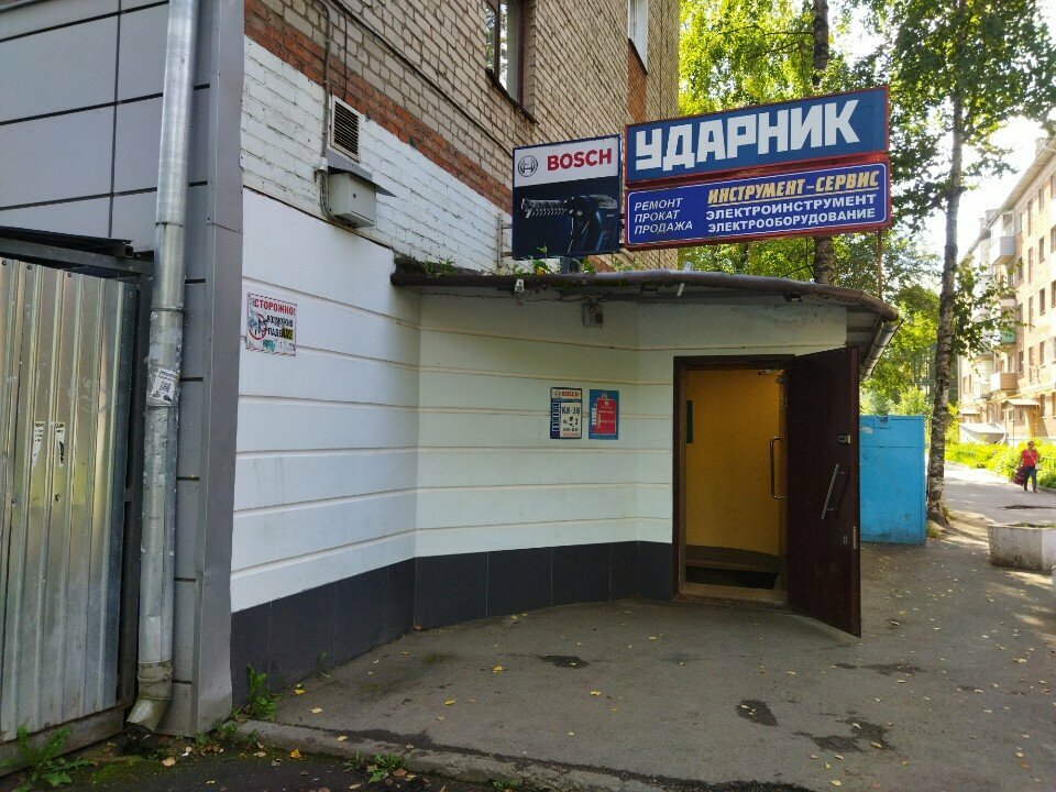 «Ударник» – строительный магазин в Вологде (ул. Можайского, 44), специализирующийся на продаже и ремонте инструментов. В ассортименте – бренды Bosch, DeWalt, Makita, Зубр, Интерскол, AEG. Оказывает услуги по ремонту бензо- и электроинструментов, включая болгарки, шуруповерты, триммеры, бензопилы, сварочное оборудование и др.