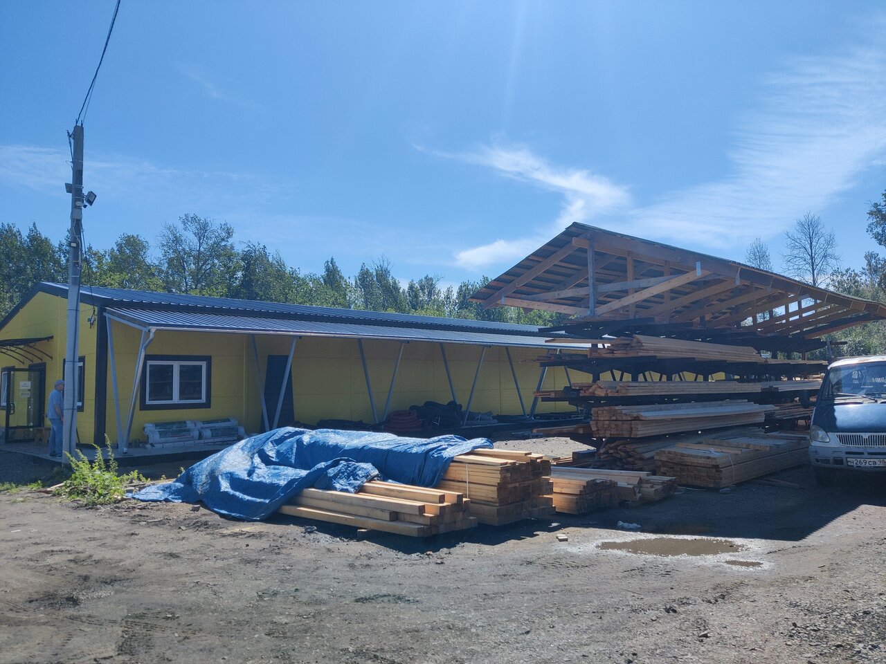 База расширяется, построили и уже открыли новый ангар. Убирают доски под крышу. Продавцы вежливые. В прошлом году покупали ондулин, по цене как в Вимосе в Кировске. Но надо поглядывать на срок годности товаров, видимо с переездом, продавцы не успели отследить.
