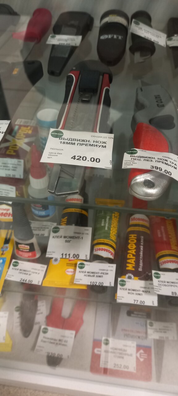 - Большой ассортимент товаров (крепеж, сантехника, электрика, инструменты)