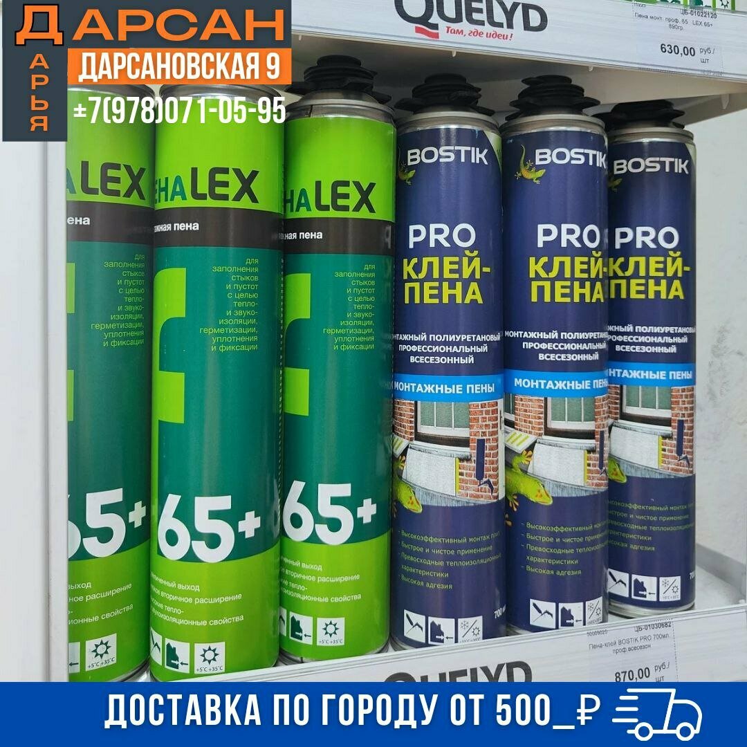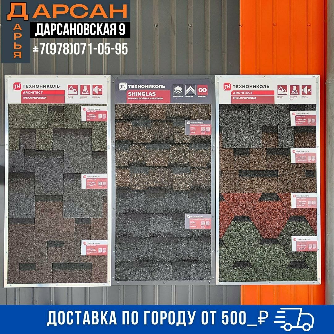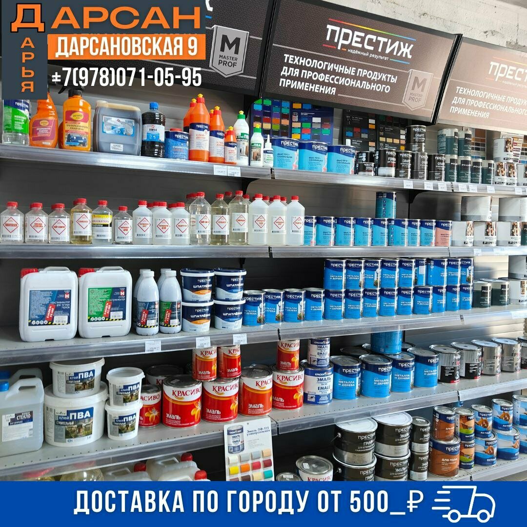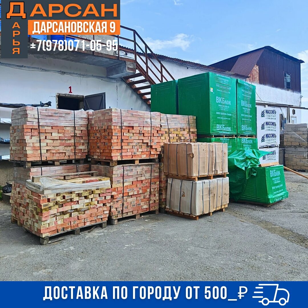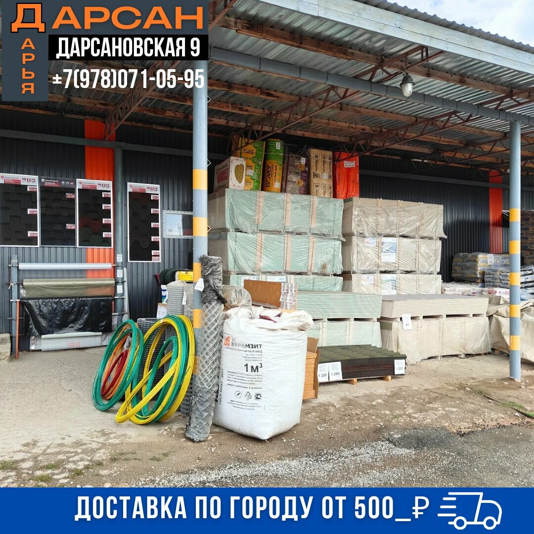 Дарсан — строительный магазин в Ялте, расположенный по адресу: ул. Дарсановская, 9. Ассортимент включает амбарную доску, газобетон, ЦСП, люки, мраморную крошку, шлакоблоки, лепнину из полиуретана, алюминиевые композитные панели, природный камень, скрытый плинтус, стеновые панели и асбест. Режим работы: пн–пт 08:00–17:00, сб 08:00–16:00. Контактный телефон: +7 (978) 071-05-95.