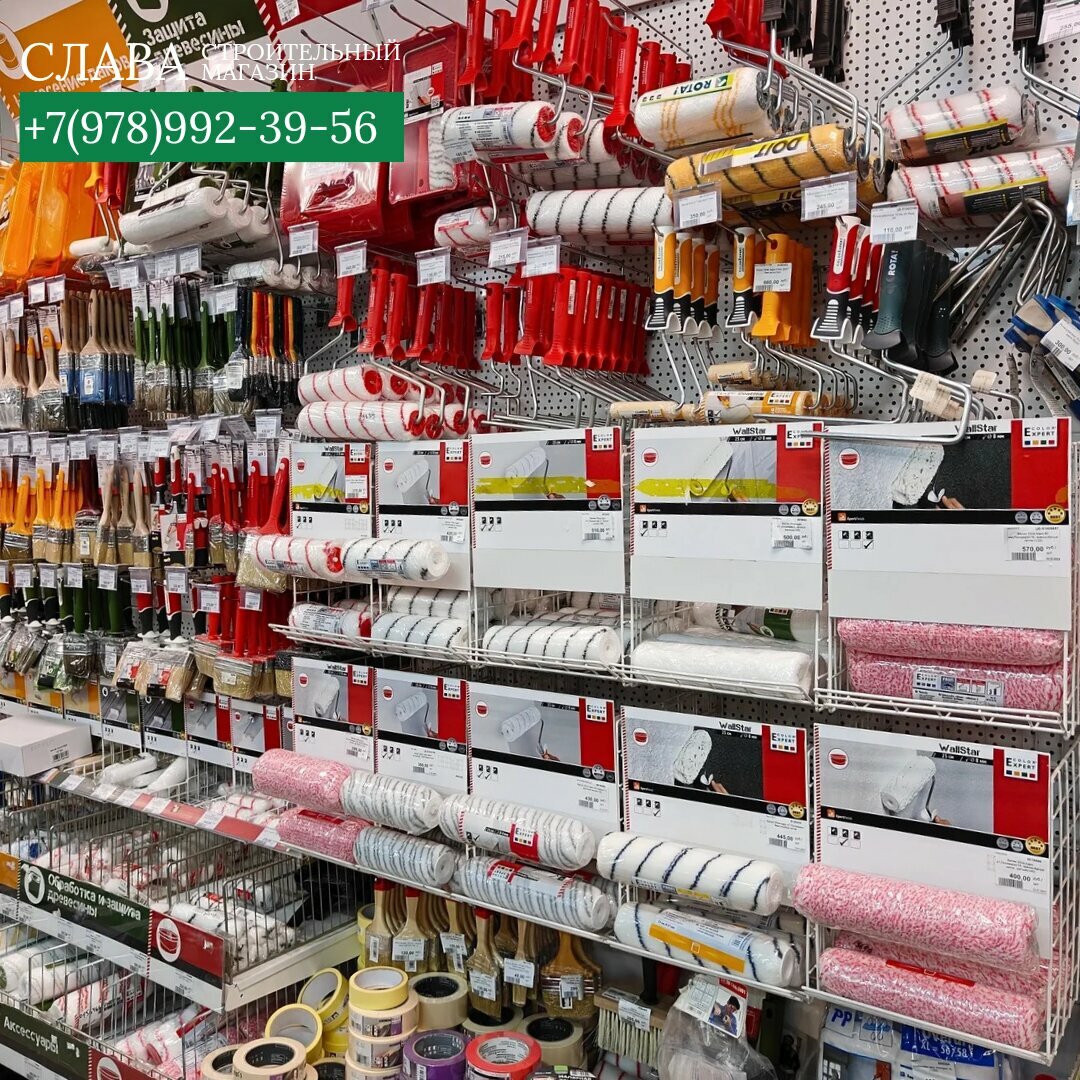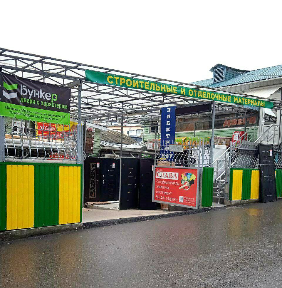 Строительный магазин «Слава» в Ялте (ул. Куйбышева, 3) предлагает широкий ассортимент материалов для строительства и ремонта: газобетон, лепнину из полиуретана, природный камень, скрытый плинтус, стеновые панели, инженерную сантехнику, люки и услуги колеровки.