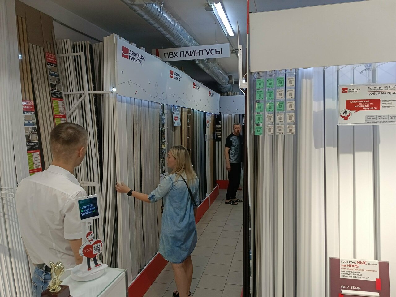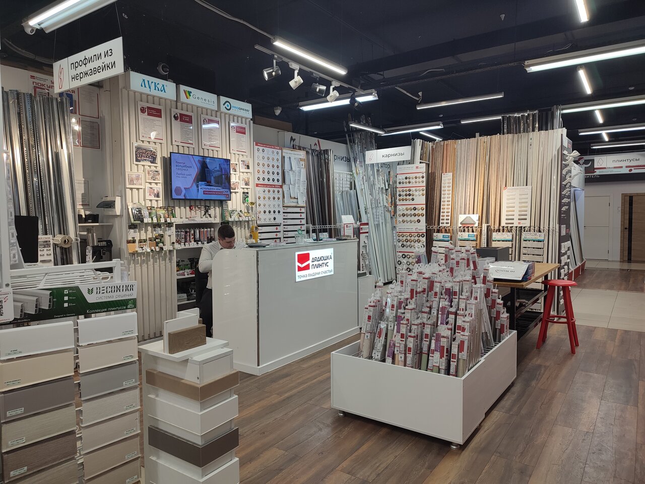 Отзывчивый персонал. Проконсультировали по плинтусам и карнизам. Выбор товара большой. Еще скидку 10 % дают. Рекомендую.