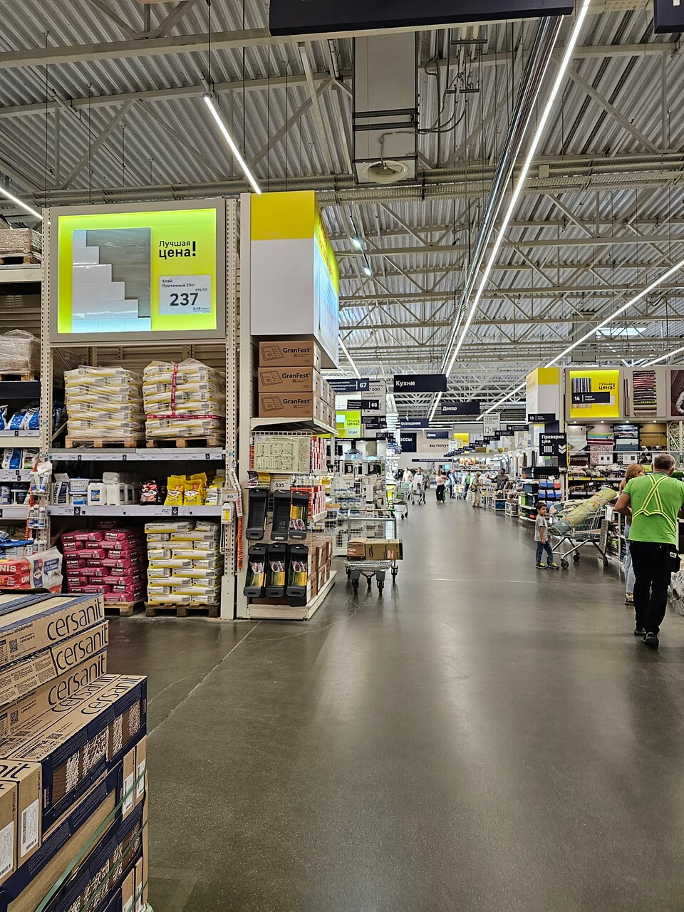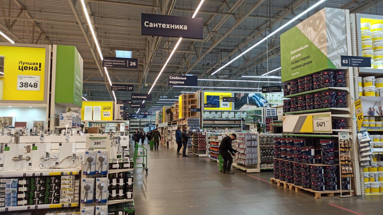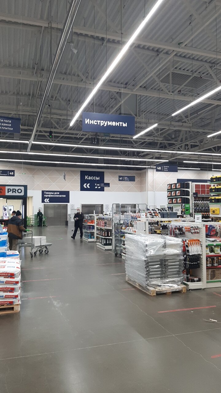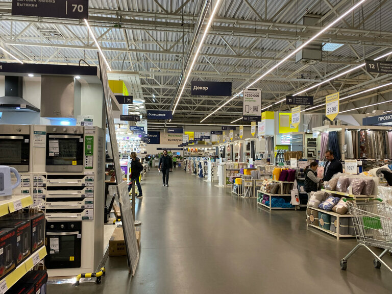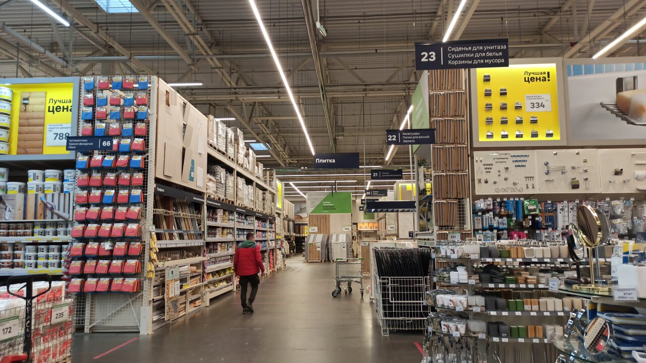 Хороший магазин, даже после введенных санкций очень много разных товаров. Очень часто покупаю всякие мелочи для работы, особенно если нужно что-нибудь отремонтировать. Недавно покупали плитку для дома, очень красивая и качественная,выбор довольно приличный. Очень нравится отдел светильников, декора и товаров для дома и сада. Семена всегда прорастают))). Продавцы-консультанты всегда помогут и подскажут, кассиры тоже всегда любезные и приветливые. И самое главное-не очень далеко от дома, часто ходим пешком.