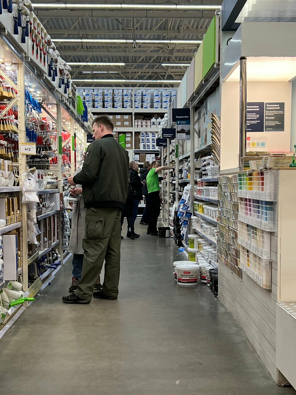Есть всё для ремонта.По выходным много людей, Менеджер подскажет, расскажет,но иногда его приходиться искать) Хороший магазин.Если остаётся лишний купленный товар, можно вернуть.