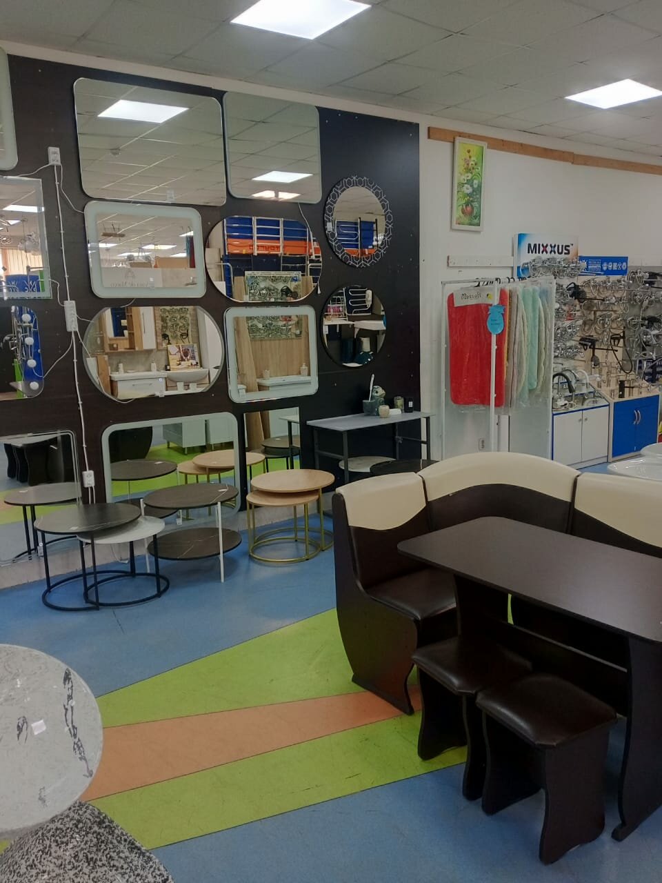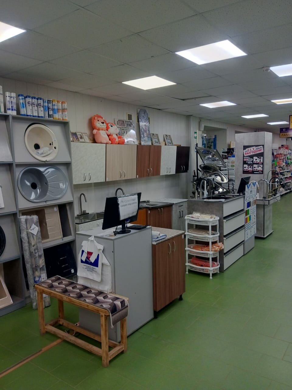 Так-то очень хороший магазин,имеет ещё 1-2 филиала в городе. Сейчас НОРМАЛЬНЫЙ персонал. Раньше был хуже… Есть обои со скидками,ковры,сантехника…дают скидочные карты и проводят розыгрыши